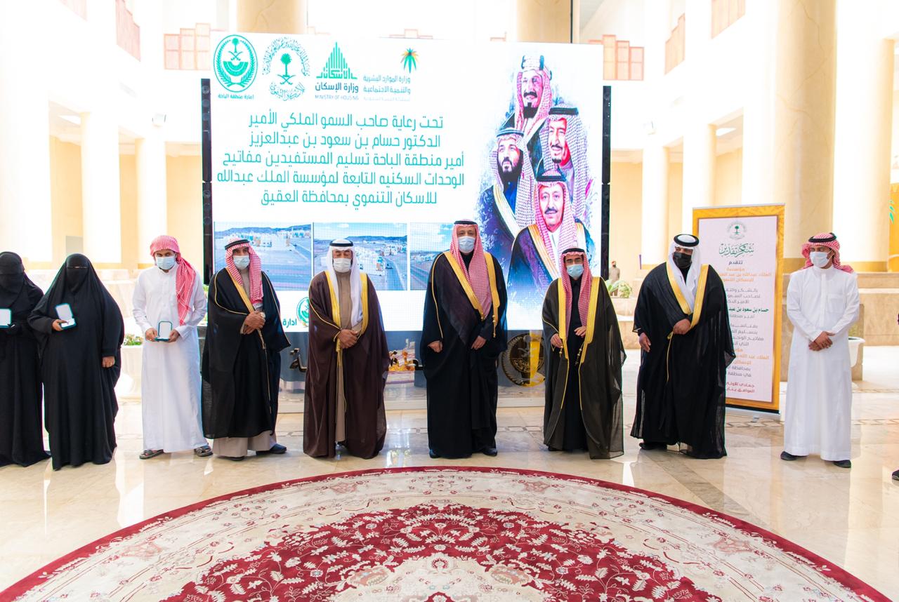 سلم صاحب السمو الملكي الأمير الدكتور حسام بن سعود بن عبدالعزيز أمير منطقة الباحة رئيس اللجنة التنفيذية للإسكان التنموي بالمنطقة بديوان الإمارة اليوم ، 100 وحدة سكنية بمجمع اسكان الملك عبدالله بمحافظة العقيق للمستفيدين ، حيث نفذت مؤسسة الملك عبدالله الخيرية هذا المشروع بقيمة 42 مليون ريال ، مع مبادرة انشاء البنية التحتية من وزارة الاسكان بقيمة تجاوزت 4 ملايين ريال ، ومبادرة التأثيث من وزارة الموارد البشرية والتنمية الاجتماعية باكثر من 3 ملايين ريال ، لتصبح القيمة الإجمالية للمشروع حوالي 50 مليون ريال .