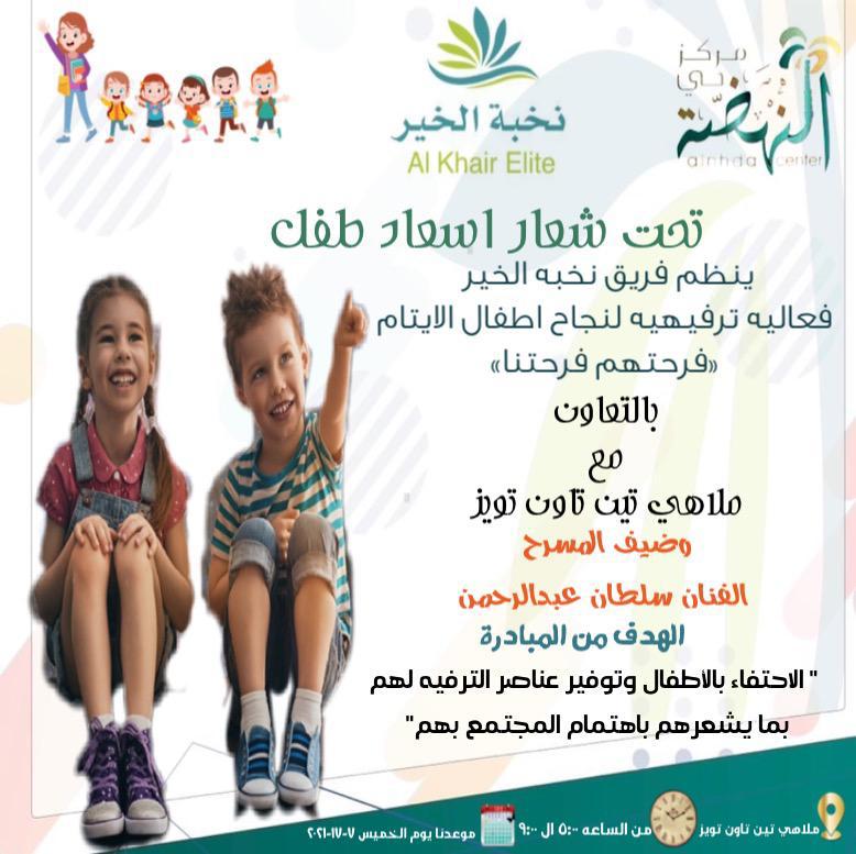 أطلق فريق نخبة الخير التطوعي بقيادة الأستاذة فدوة المسعودي مبادرة بعنوان إسعاد طفل يتيم في إحدى ملاهي جدة الشهيرة والتي تهدف إلى إسعادهم وإدخال السرور عليهم وقد تولى تقديم المبادرة الممثل سلطان عبدالرحمن والتي اشتملت على فقرات منوعة ومتنوعة من فوازير ومسابقات وأركان كذلك للرسم والأعمال الحرفية وتقديم بطاقات للأطفال للمشاركة في الألعاب الإلكترونية وقد شارك في المبادرة الأستاذ عبدالله المولد بكلمة رائعة ومميزة .