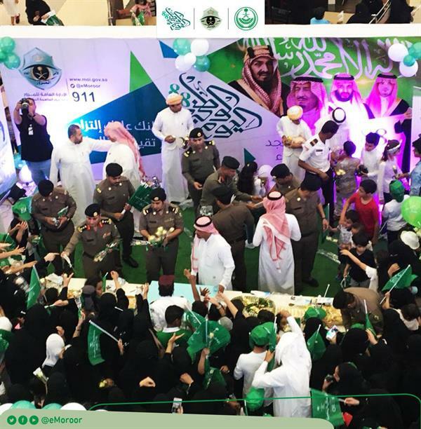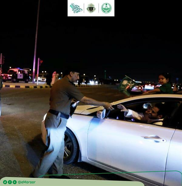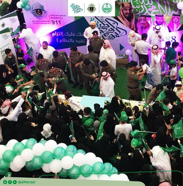 تفاعل المرور السعودي بمدن المملكة المختلفة مع الذكرى الـ 88 لليوم الوطني للمملكة بالمشاركة في فعالياته والاحتفاء به مع قائدي المركبات وتنظيمها في مواقع الاحتفالات.