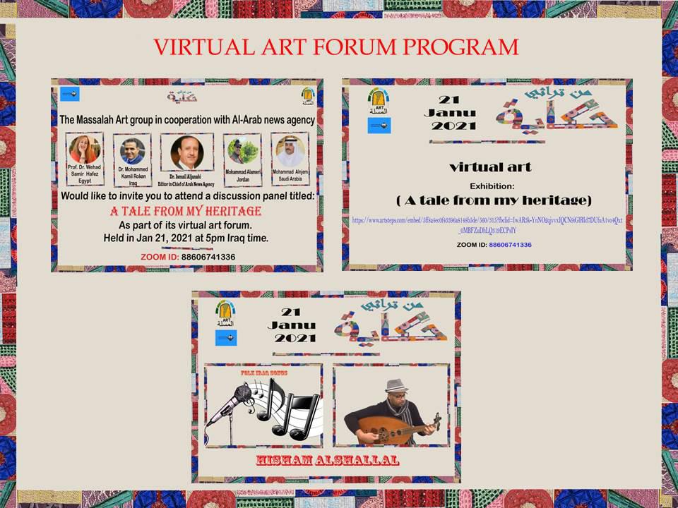 جمهورية العراق ، جمهورية مصر العربية ،المملكة الاردنية الهاشمية، السودان، الكويت، الجزائر، مملكة المغرب، فلسطين الولايات المتحده الأمريكية، ويختتم بأمسية غنائية عن التراث العربي يقدمها المطرب : هشام الشلال من امريكا وقد صرحت ايضاً انة بعد الإتفاق مع أعضاء الهيئة الإدارية لمسلة ارت سيصبح هذا الملتقى سنوي و بنفس التاريخ في ٢١ يناير من خلال العالم الافتراضي الانترنت لحين زوال الجائحة العالمية كوفيد 19 .