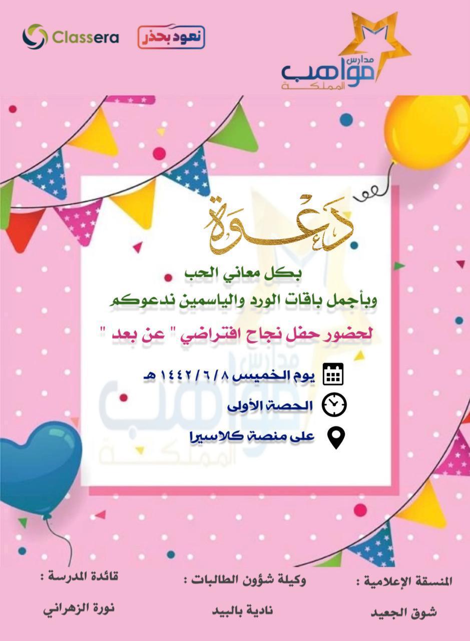 من هذا المنطلق احتفلت مدرسة مواهب المملكة الابتدائية يوم الخميس الموافق ١٤٤٢/٦/٨ تحت اشراف قائدة المدرسة أ.نوره الزهراني بنجاح طالبات المدرسة وتسليمهن شهادات النجاح و ثم ألقت قائدة المدرسة على الطالبات كلمه عن النجاح والجد والمثابرة لنيل أعلى المراتب و كما شكرت المعلمات و عاملات المدرسة و بعد ذلك تلقين الطالبات التبريكات من منسوبات المدرسة وفي نهاية الحفل ألقت وكيلة شؤون الطالبات الأستاذة نادية بالبيد كلمة شكر للامهات و للطالبات وحث الطالبات على المزيد من النجاح و التفوق هذا وصلى الله وسلم على نبينا محمد صلى الله عليه وسلم .