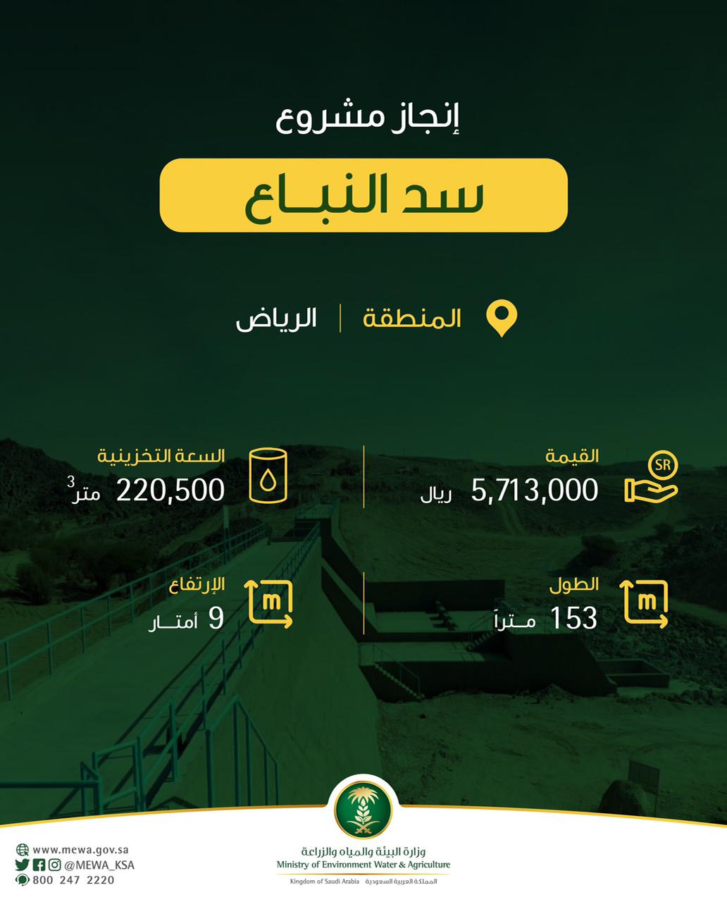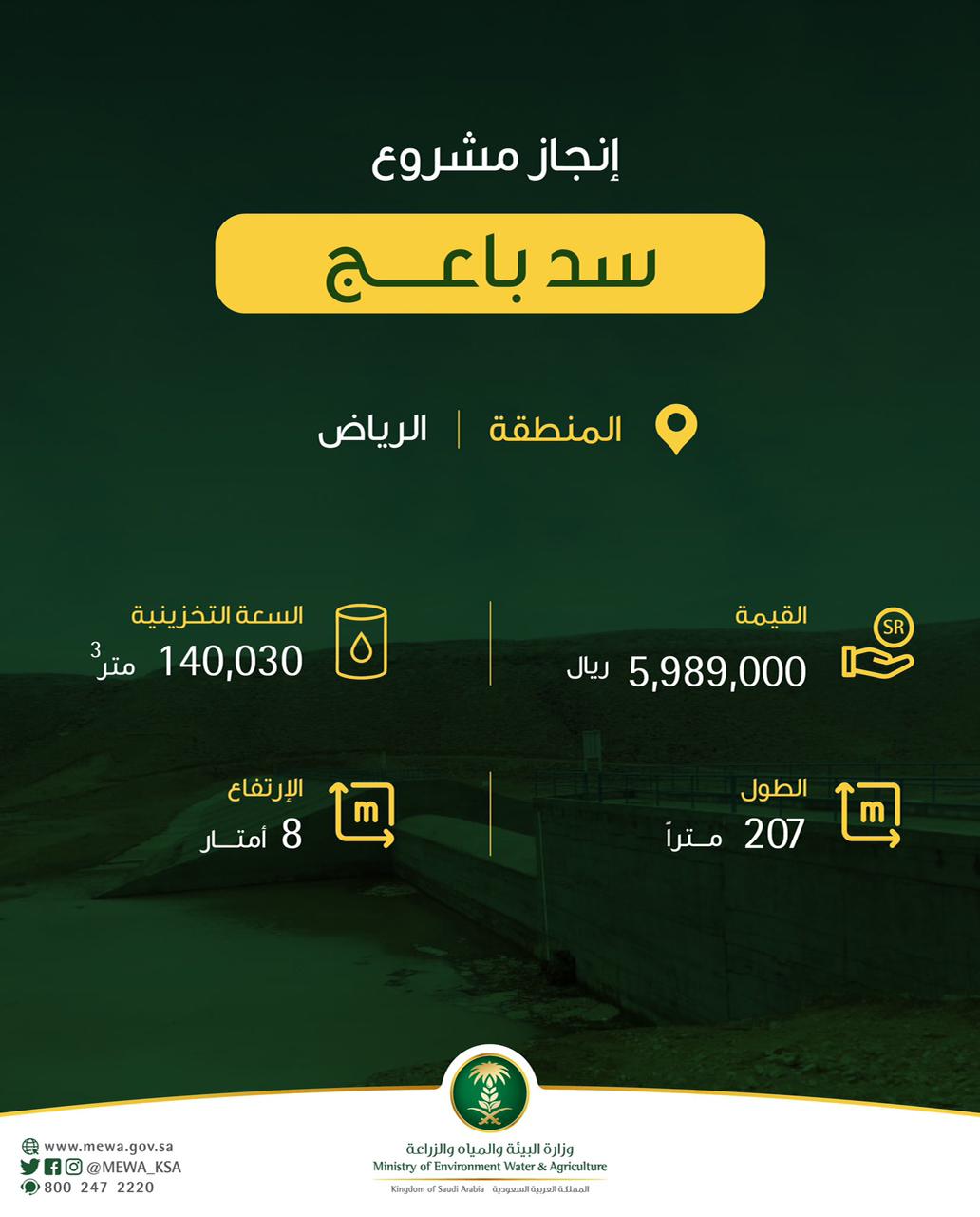 وأوضحت الوزارة، أن مشروعات السدود التي تم إنشاؤها تشمل سد وادي أسمير، بقيمة 8,936,000 ريال، وطول 174 متراً، وارتفاع 12 متراً، وبسعة تخزينية تبلغ 726,465 متر مكعب، ومشروع سد باعج بقيمة 5,989,000 ريال، وطول 207 أمتار، وارتفاع 8 أمتار، وبسعة تخزينية تبلغ 140,030 متر مكعب، ومشروع سد النباع بقيمة 5,713,000 ريال، وطول 153 متراً، وارتفاع 9 أمتار، وبسعة تخزينية تبلغ 220,500 متر مكعب، بالإضافة إلى مشروع سد الشعبة بقيمة 5,152,000 ريال، بطول 420 متراً، وارتفاع 6 أمتار، وبسعة تخزينية 425,000 متر مكعب.