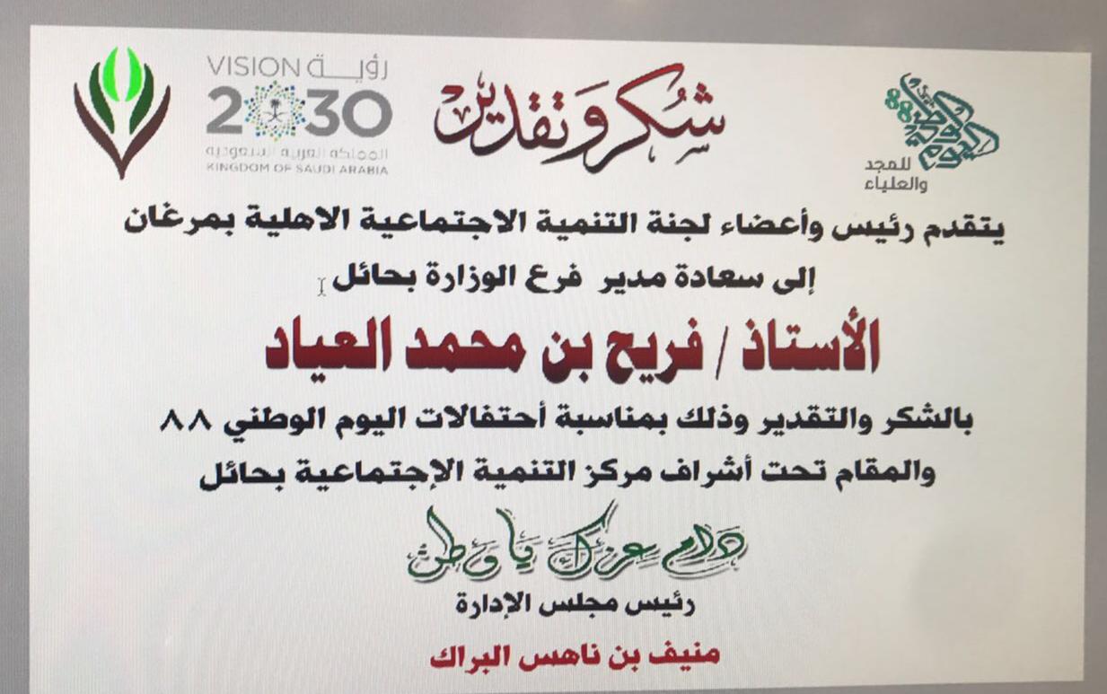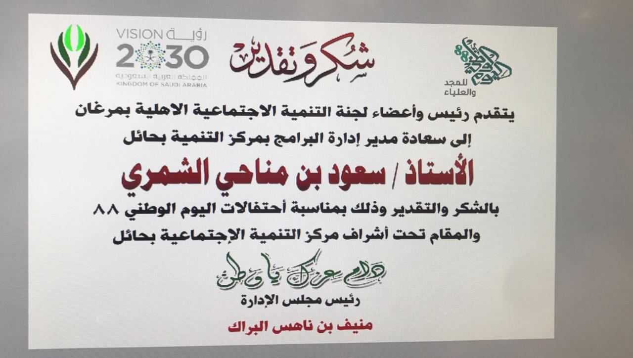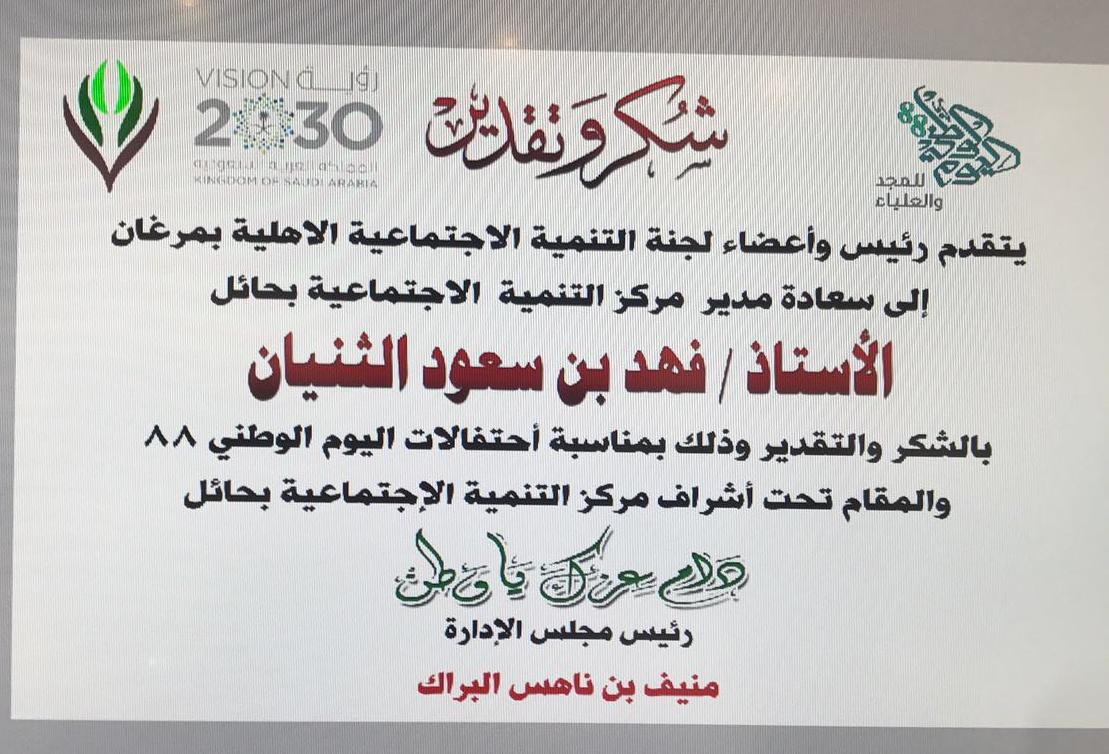 حيث شاركت لجنة التنمية بمرغان بعدة مسابقات وهدايا للزوار وجوائز ممثلة برئاسة مجلس الادارة الاستاذ منيف بن ناهس البراك كما قام رئيس اللجنة بتقديم درع تذكاري يحمل أسم التنمية الاجتماعية الاهلية بمرغان لصاحب السموالملكي نائب أميرمنطقة حائل الأميرفيصل بن فهد بن مقرن أثناء زيارته كما قدم دروع تذكارية كل من الاستاذ فريح العياد مدير عام الفرع “والاستاذ فهد الثنيان “والأستاذ سعود الشمري
