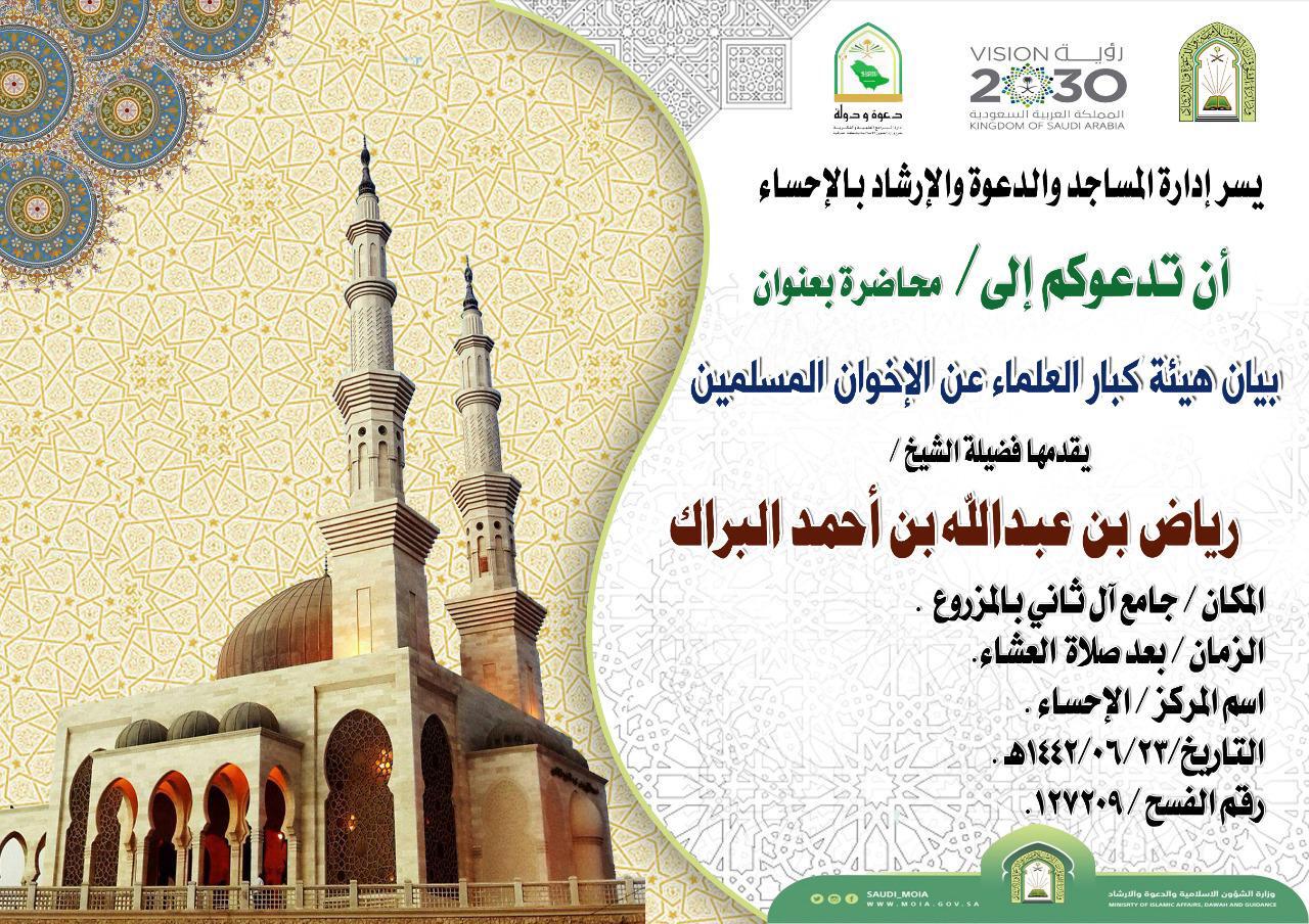 يواصل فرع وزارة الشؤون الإسلامية والدعوة والإرشاد بالمنطقة الشرقية، يوم الجمعة القادم تنفيذ سلسلة من المحاضرات الدعوية بعنوان: (بيان هيئة كبار العلماء عن الإخوان المسلمين) في عدد من جوامع محافظة الإحساء بعد صلاتي المغرب والعشاء.