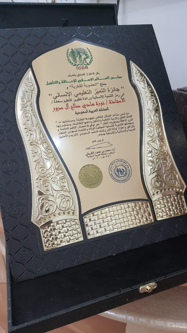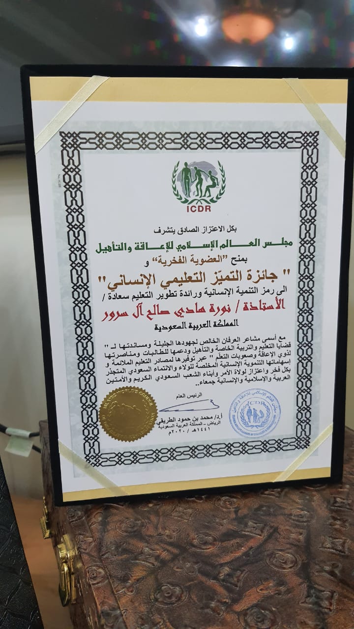 نظير جهودها ومساندتها قضايا التعليم والتربية الخاصة والتأهيل من خلال دعمها طالبات ذوي الإعاقة وصعوبات التعلم عبر توفير مصادر التعلم الملائمة ؛ وإسهاماتها التنموية الإنسانية .