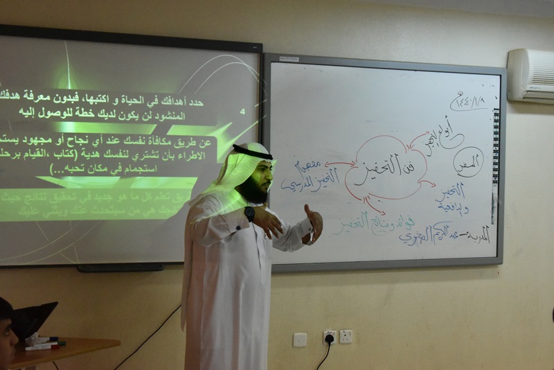 بعدها ناقش الصخري مع الطلاب عدد من النقاط المهمة في دوافع السلوك و عناصر التحفيز الذاتي ، و التحكم في المؤثرات الداخلية و الخارجية .