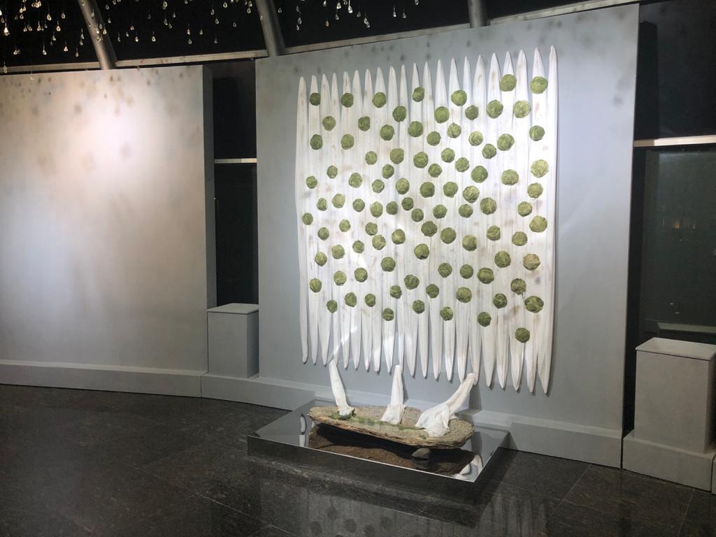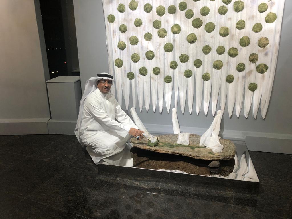 استثمر الصخر والماء وأكثر من 20 ألف قطرة ماء من مادة الايبوكسي والمعلقة بـ ١٥ ألف متر من الخيوط ليجسد معرضه الفني الذي سرد فيه احداثاً من ذاكرة التاريخ ويعد التاسع في مسيرته الفنية التي تمتد لعقود من الزمن انه الفنان التشكيلي احمد حسين الغامدي.