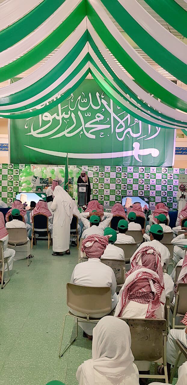 دشن محافظ الحناكية الاستاذ راشد بن عبدالله القحطاني فعاليات اليوم الوطني الثامن والثمانين في متوسطة ابي هريرة ، صباح اليوم الثلاثاء 1440/1/15