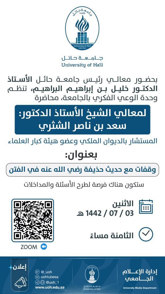 برعاية معالي رئيس جامعة حائل تنظم وحدة الوعي الفكري بجامعة حائل محاضرة افتراضية لمعالي الدكتور سعد بن ناصر الشثري، المستشار بالديوان الملكي وعضو هيئة كبار العلماء، بعنوان: (وقفات مع حديث حذيفة رضي الله عنه في الفتن)، يوم الاثنين 1442/7/3، الساعة 8 مساءً.