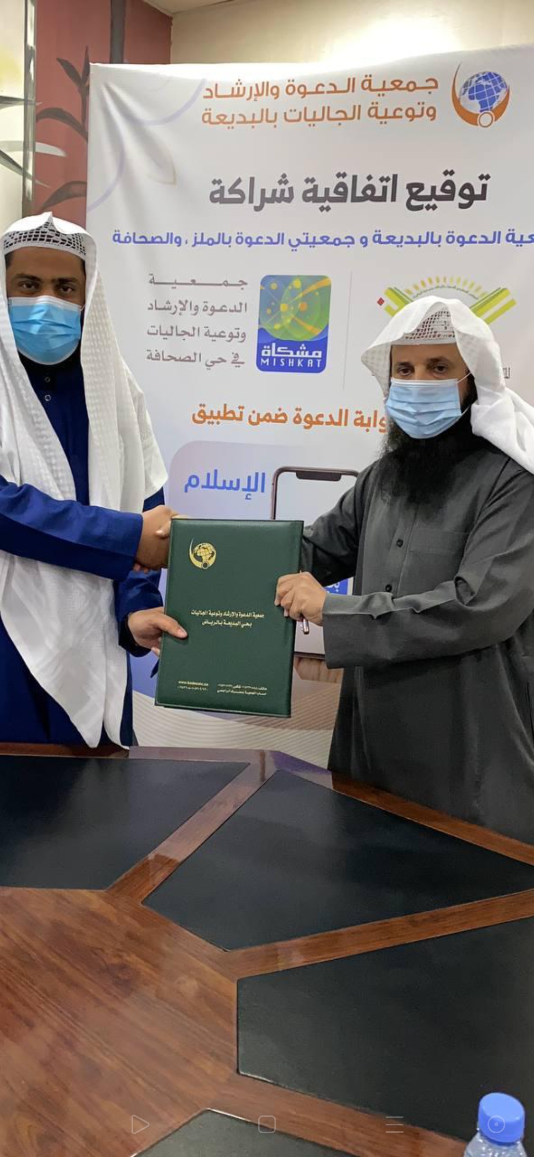 وأبرمت جمعية الدعوة والإرشاد في البديعة (المالكة لحقوق التطبيق) أمس في الرياض أتفاقية تعاون مع جمعية الدعوة والإرشاد وتوعية الجاليات في حي الملز وجمعية الدعوة والإرشاد وتوعية الجاليات في حي الصحافة لتفعيل أدوارهما في الدعوة الى الله بالاستفادة من التقنية الحديثة واستخدام آخر ما توصلت إليه التكنولوجيا لتطويعها لخدمة الدعوة والتعريف بالإسلام.