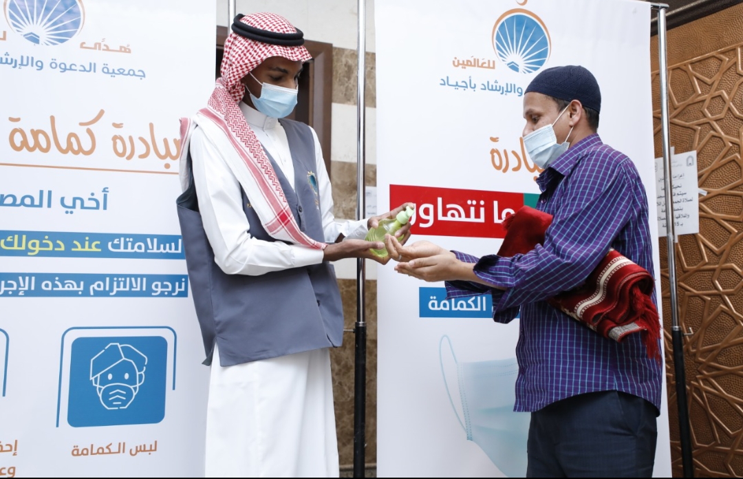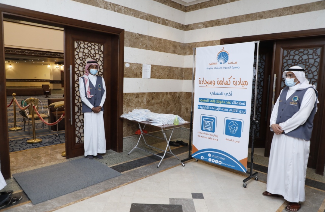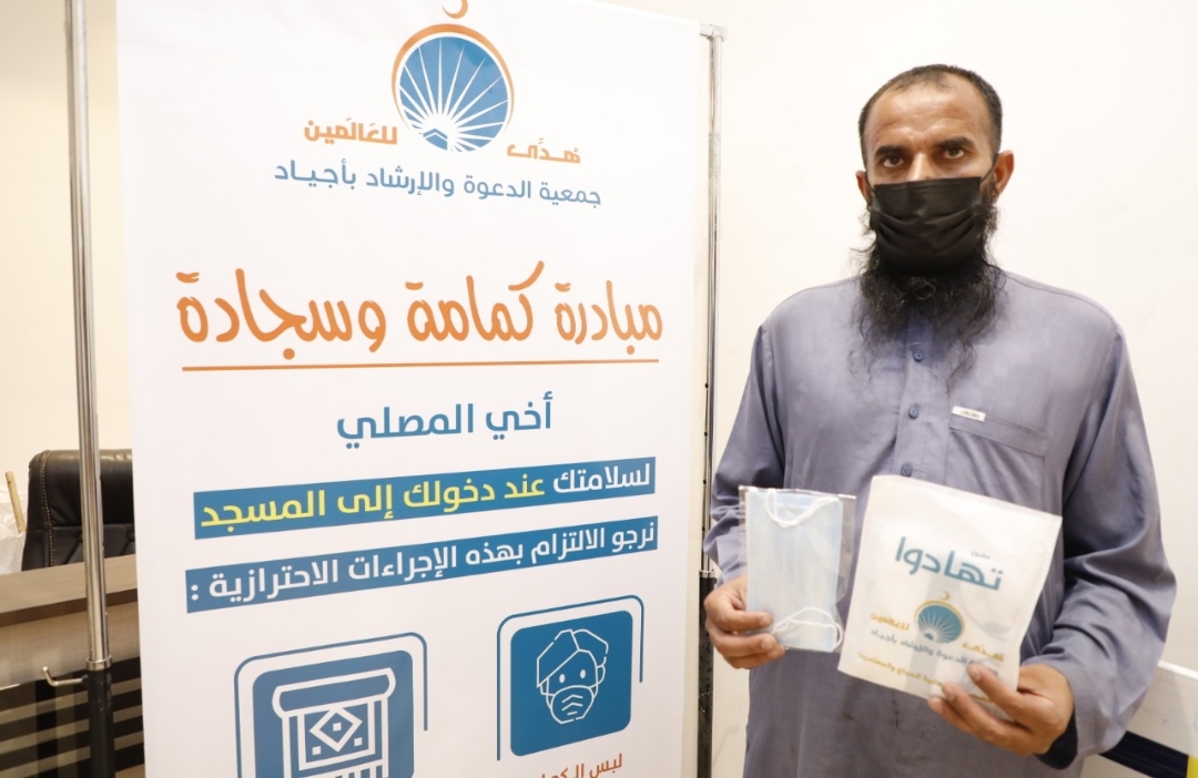 أطلقت جمعية الدعوة والإرشاد وتوعية الجاليات بأجياد في مكة المكرمة، مبادرة توعوية بعنوان “كمامة وسجادة”, تهدف إلى تطبيق الإجراءات الاحترازية التي وضعتها الجهات المختصة بالمملكة، من خلال توزيع الكمامات الطبية وسجادة صلاة على المصلين في المساجد.