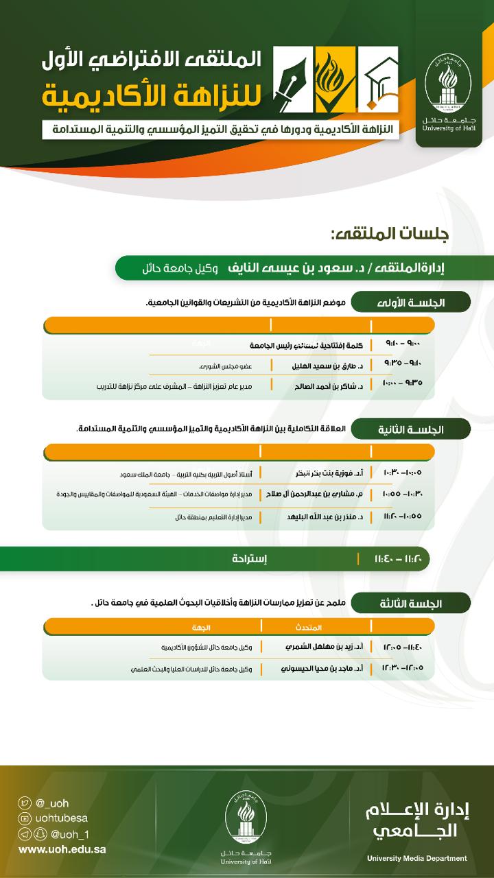 تحت رعاية معالي رئيس جامعة حائل الأستاذ الدكتور خليل بن إبراهيم البراهيم، تنظم جامعة حائل، ممثلة في وكالة الجامعة للشؤون الأكاديمية، الملتقى الافتراضي الأول للنزاهة الأكاديمية ودورها في تحقيق التميز المؤسسي والتنمية المستدامة، وذلك يوم الثلاثاء الموافق 2-مارس- 2021 بمشاركة عدد من المتحدثين من داخل الجامعة وخارجها، وذلك عبر تطبيق زوم.