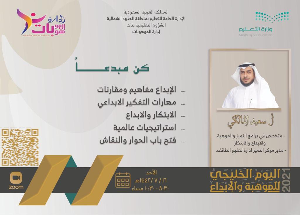 أطلقت إدارة التعليم بمنطقة الحدود الشمالية أمس، فعاليات الأسبوع الوطني الخليجي للموهبة والإبداع 2021، التي تهدف إلى توجيه مواهب الطلاب والطالبات وبناء شخصياتهم ،وتعزيز مهارت التفكير الإبداعي لديهم.