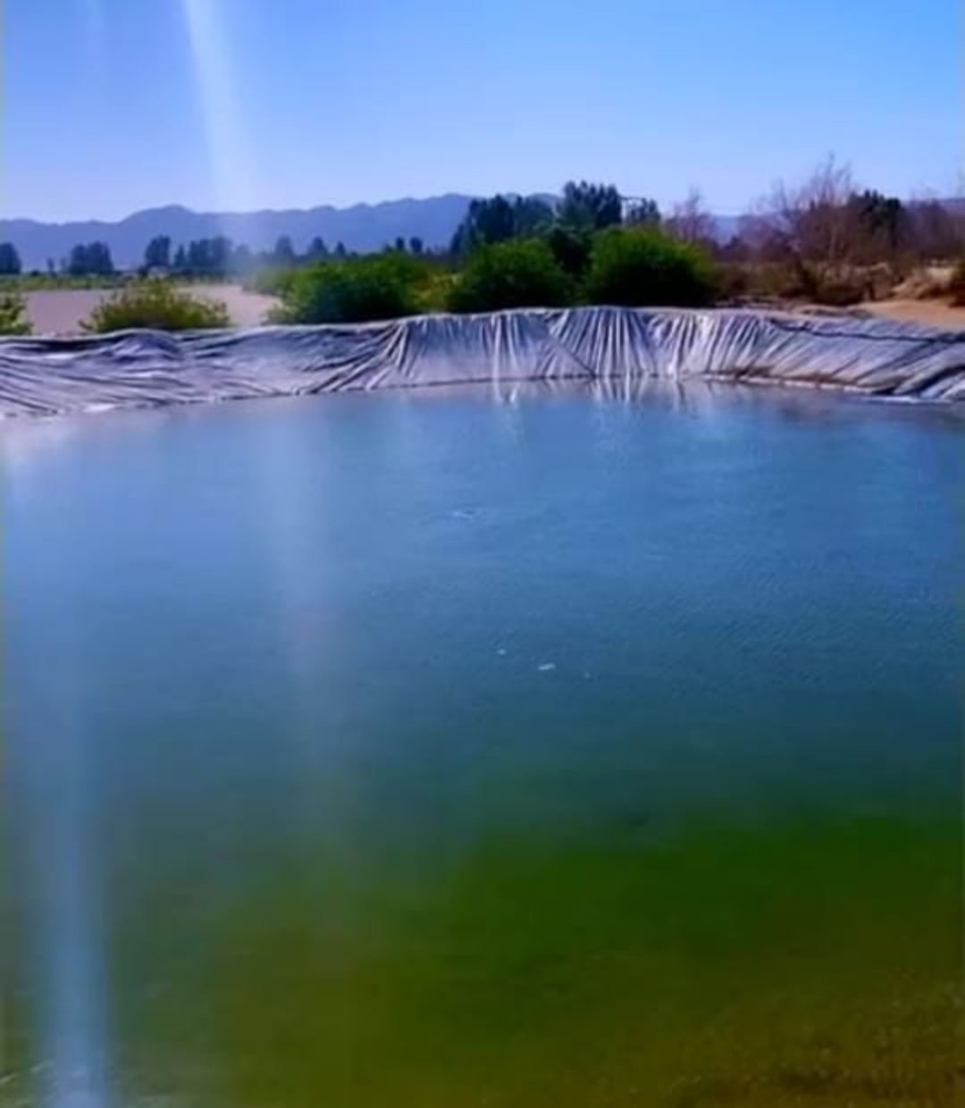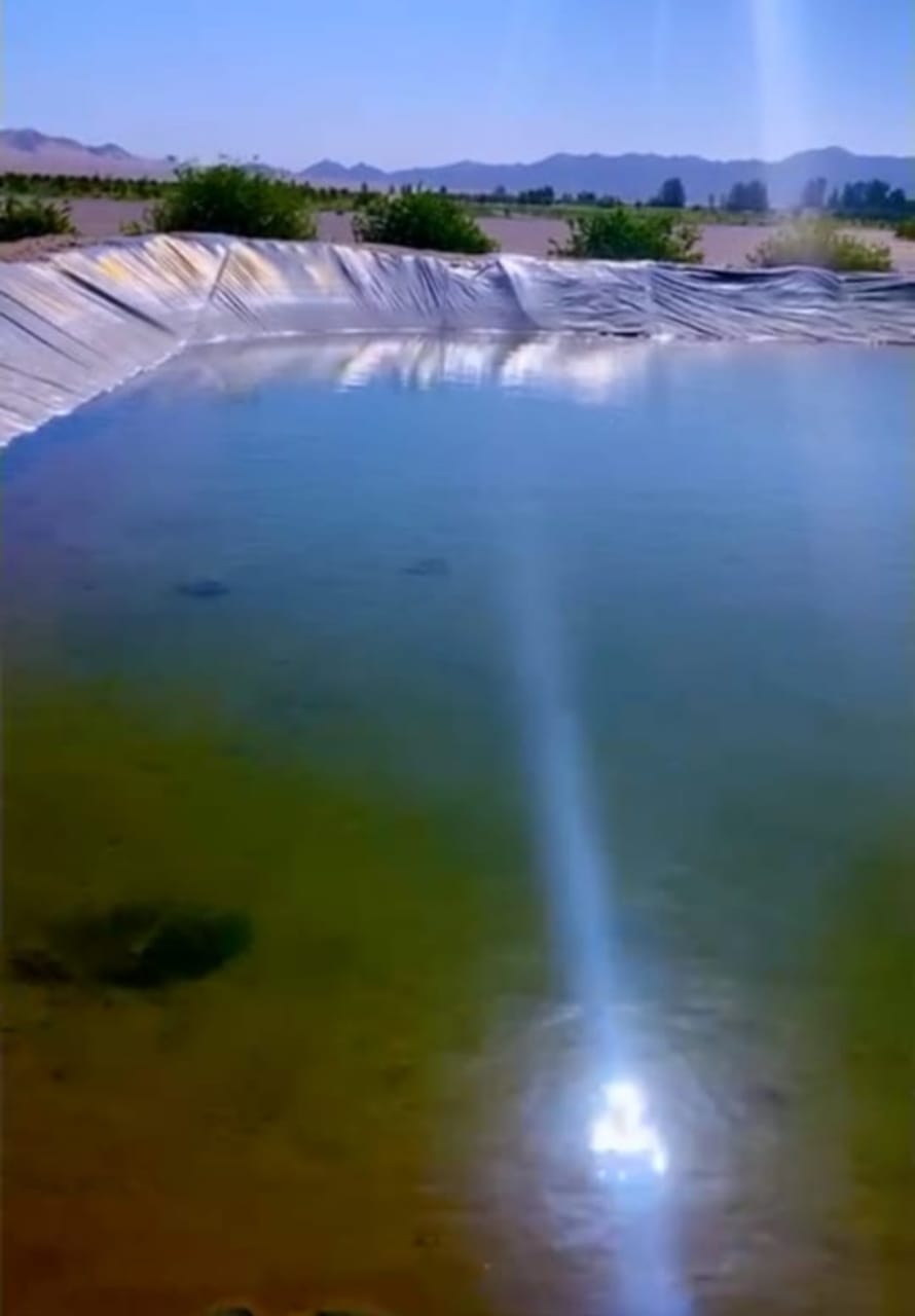 لأن مياه الري الجوفية تأتي للمزرعة من موقع بعيد نسبياً..تم هندسة هذه البركة المائية الكبيرة المساحة بأقل التكاليف حيث تم استيراد الشراع القماشي المصنوع في الأردن من مدينة تبوك بسعر يعتبر زهيداً بالنظر لحجمه وجودته وفائدته خيث لم يتجاوز قيمته الكلية 6700 ريالا فقط لاغير إذ تبلغ مساحته 30 مترًا × 30 مترًا..ومايميزه أن خامته ثقيلة جدًا ومع هندسة تثبيت الحواف بالثقالات الترابية لأطراف الشراع أصبحت مساحة البركة الكلية بهذه الهيئة 25 مترًا × 25 مترًا.