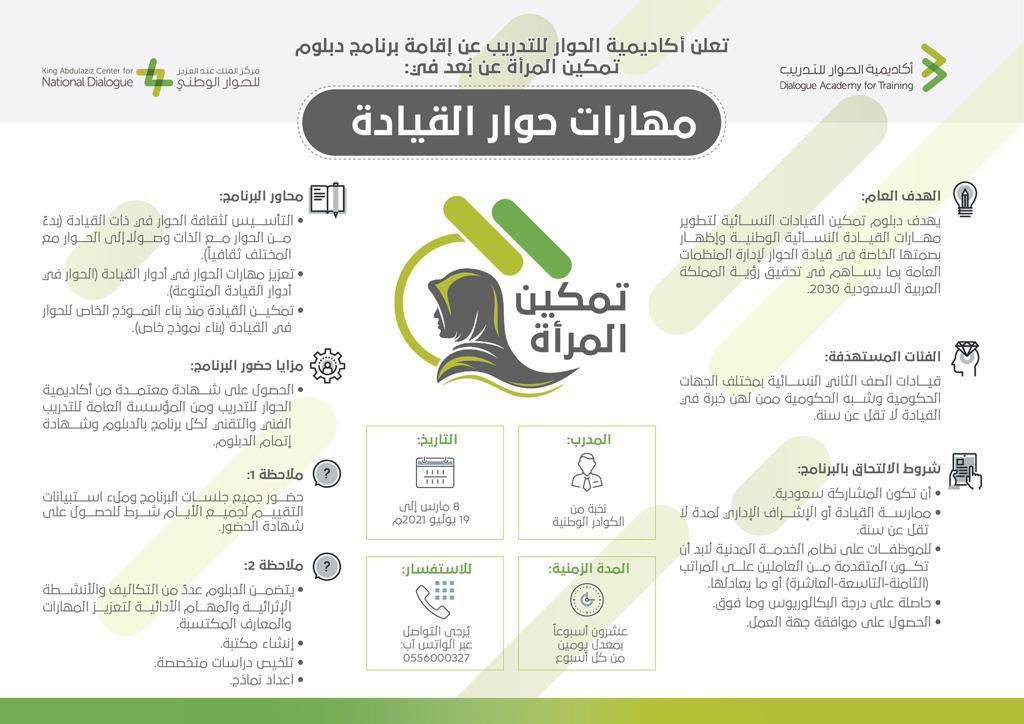 أطلقت أكاديمية الحوار للتدريب التابعة لمركز الملك عبدالعزيز للحوار الوطني برنامج دبلوم تمكين المرأة عن بعد في “مهارات حوار القيادة “، يوم الاثنين 24 رجب 1442هـ ، الموافق 8 مارس 2021م ، ويهدف البرنامج الذي جاء بالتزامن مع اليوم العالمي للمرأة ، لتطوير مهارات القيادة النسائية الوطنية ، وإظهار بصمتها الخاصة في قيادة الحوار لإدارة المنشآت بما يساهم في تحقيق رؤية المملكة 2030.