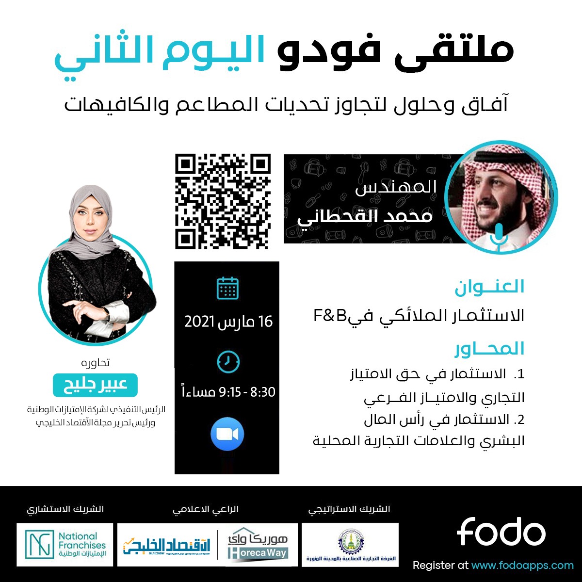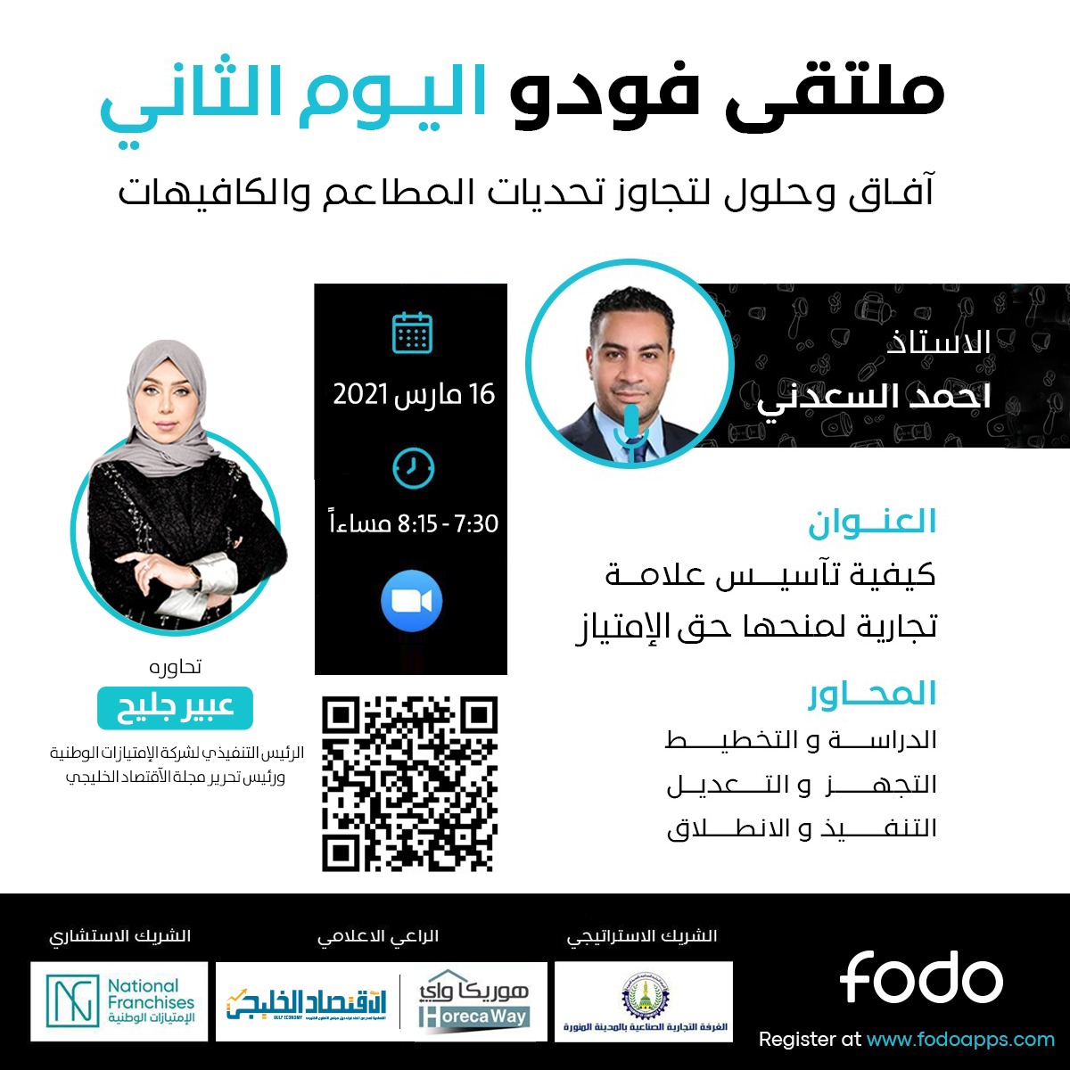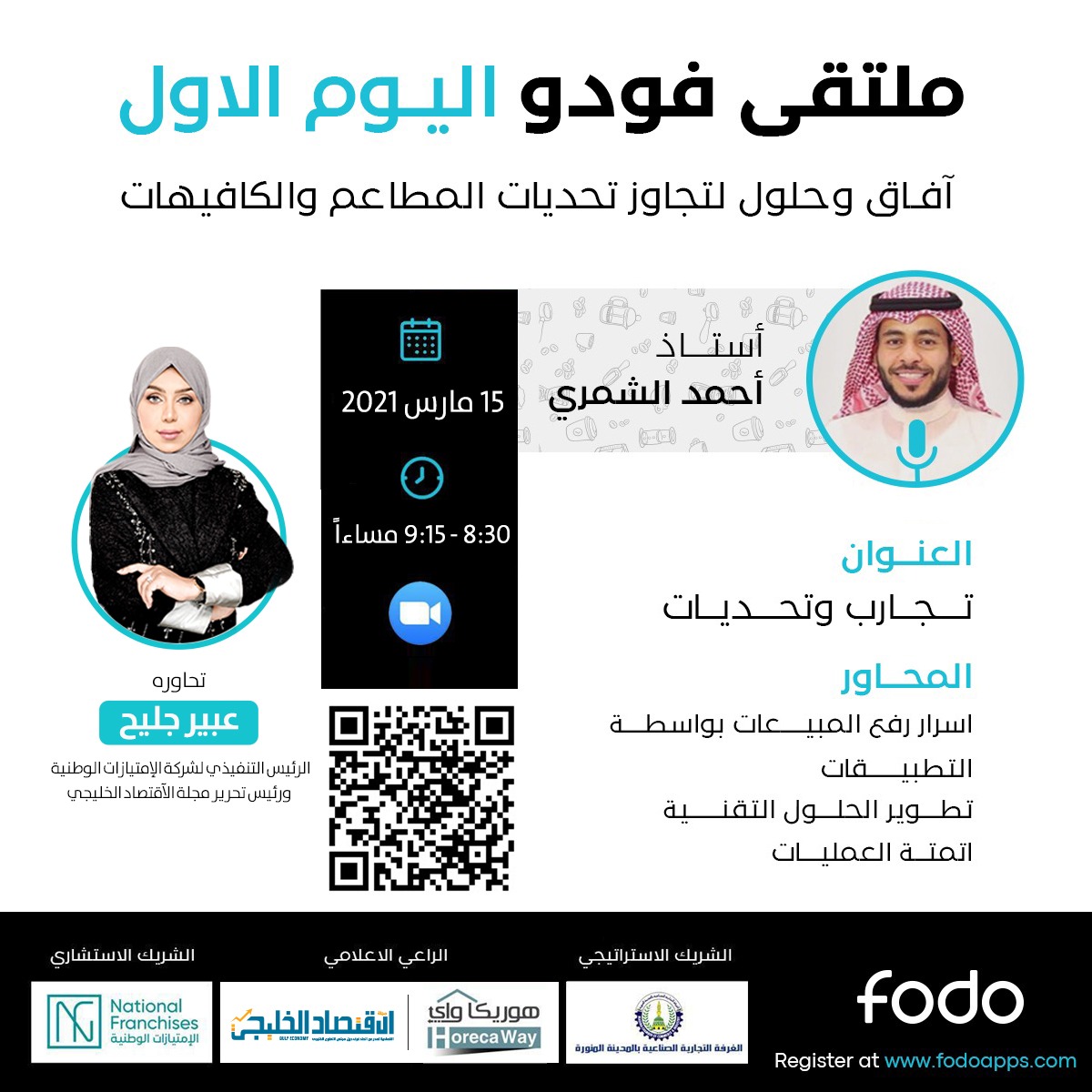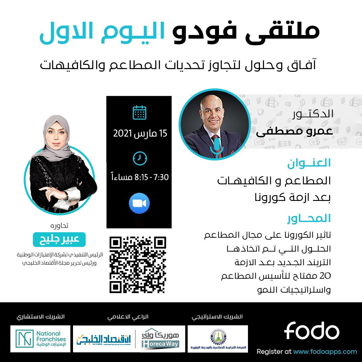 أعلنت شركة فودو لأنظمة الـ pos لإدارة المطاعم والكافيهات، عن إقامة أكبر فعالية افتراضية لأصحاب المشروعات الغذائية تحت شعار “آفاق وحلول لتجاوز تحديات المطاعم والكافيهات” وذلك عبر برنامج زووم، يومي 15-16 مارس 2021 ، وتبدأ الفعاليات يوميًا الساعة 7.30 مساءًا،