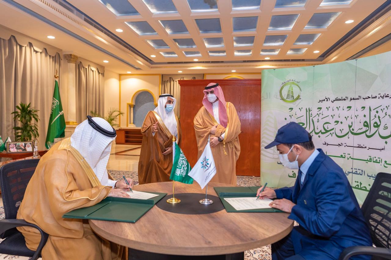 بعد ذلك شهد سمو أمير منطقة الجوف توقيع اتفاقية تعاون مشترك بين الإدارة العامة للتدريب التقني والمهني بالمنطقة ويمثلها الدكتور سعد بن عبدالعزيز السعيدان وأمانة المنطقة ويمثلها الأمين المهندس عاطف بن محمد الشرعان في مجال التدريب والتوظيف والدراسات والبحوث.