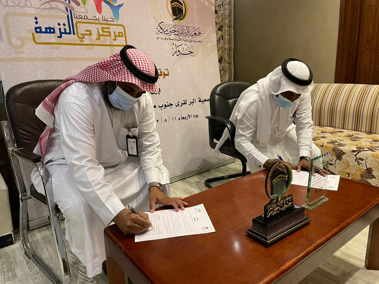 تم صباح هذا اليوم الأربعاء – ( 11/8/1442 ) – هــ ، بمقر مركز ” حي النزهة ” توقيع عقد شراكة تعاونية تجمع بين مركز حي النزهة و جمعية البر لقرى جنوب مكة ” جوار ” .
