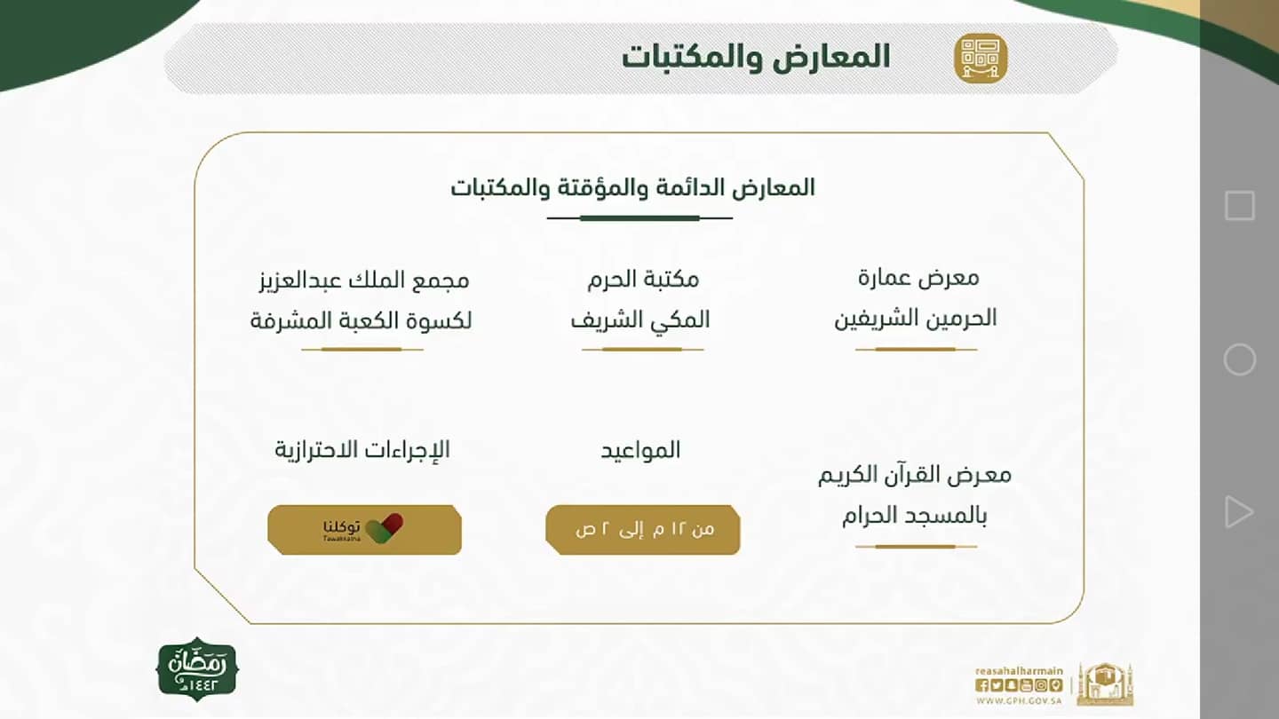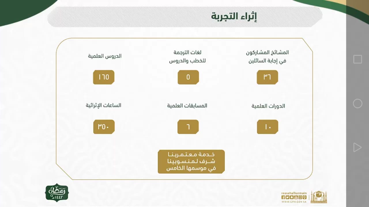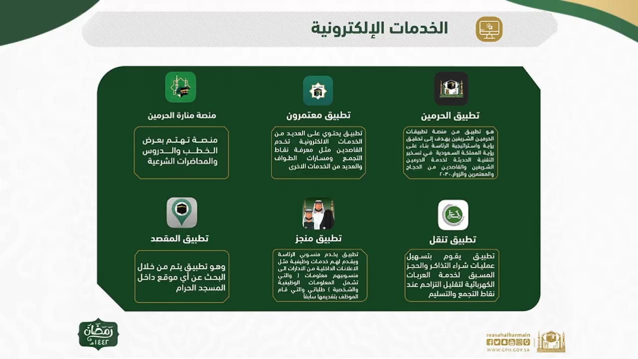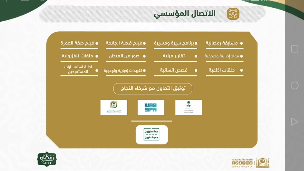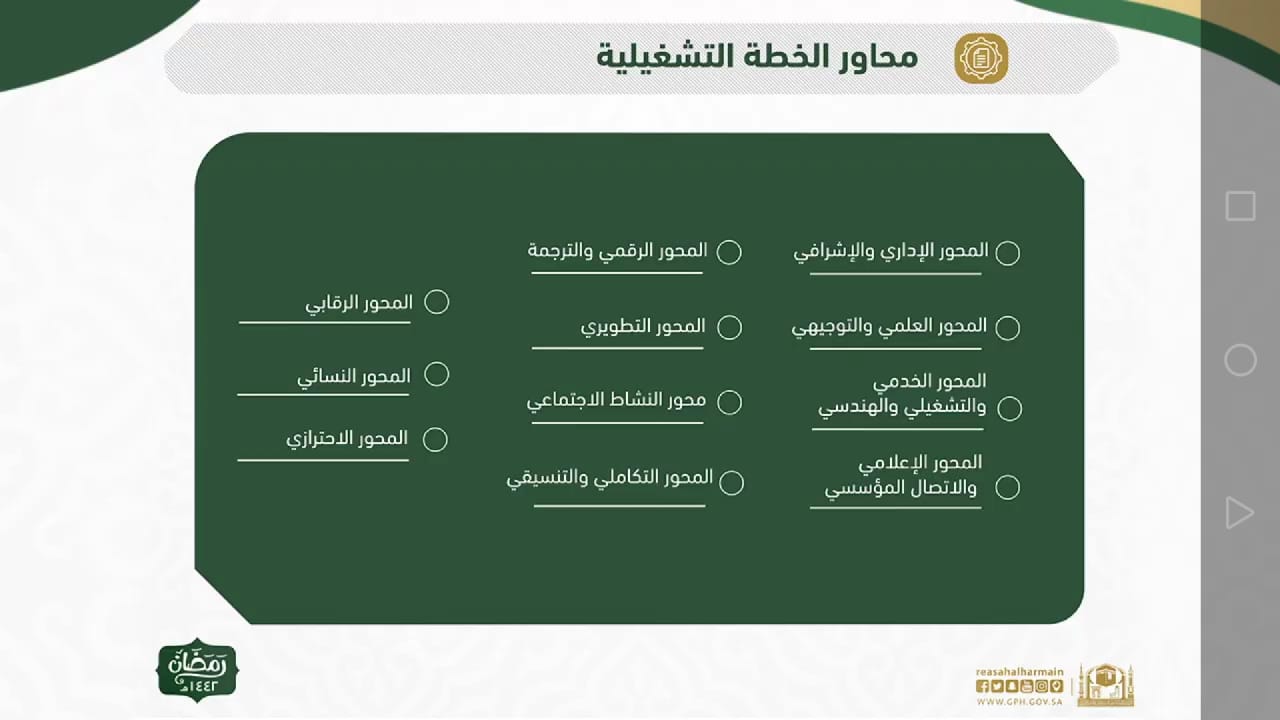 أعلن معالي الرئيس العام لشؤون المسجد الحرام والمسجد النبوي الشيخ الأستاذ الدكتور / عبدالرحمن بن عبدالعزيز السديس ، اليوم ، بمقر الرئاسة العامة بمكة المكرمة ، بحضور معالي وزير الإعلام المكلف الدكتور / ماجد بن عبدالله القصبي؛، و مشاركة عددٍ من الإعلاميين ، عن ( 10 ) محاور رئيسية تضمها خطة الرئاسة لموسم رمضان المبارك (1442ه)، خلال الملتقى الإعلامي الذي أقامته الرئاسة العامة عن بعد .