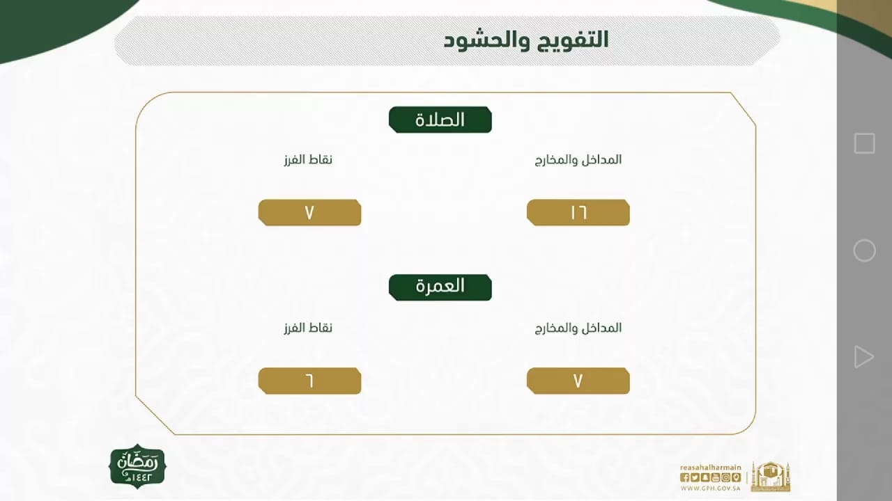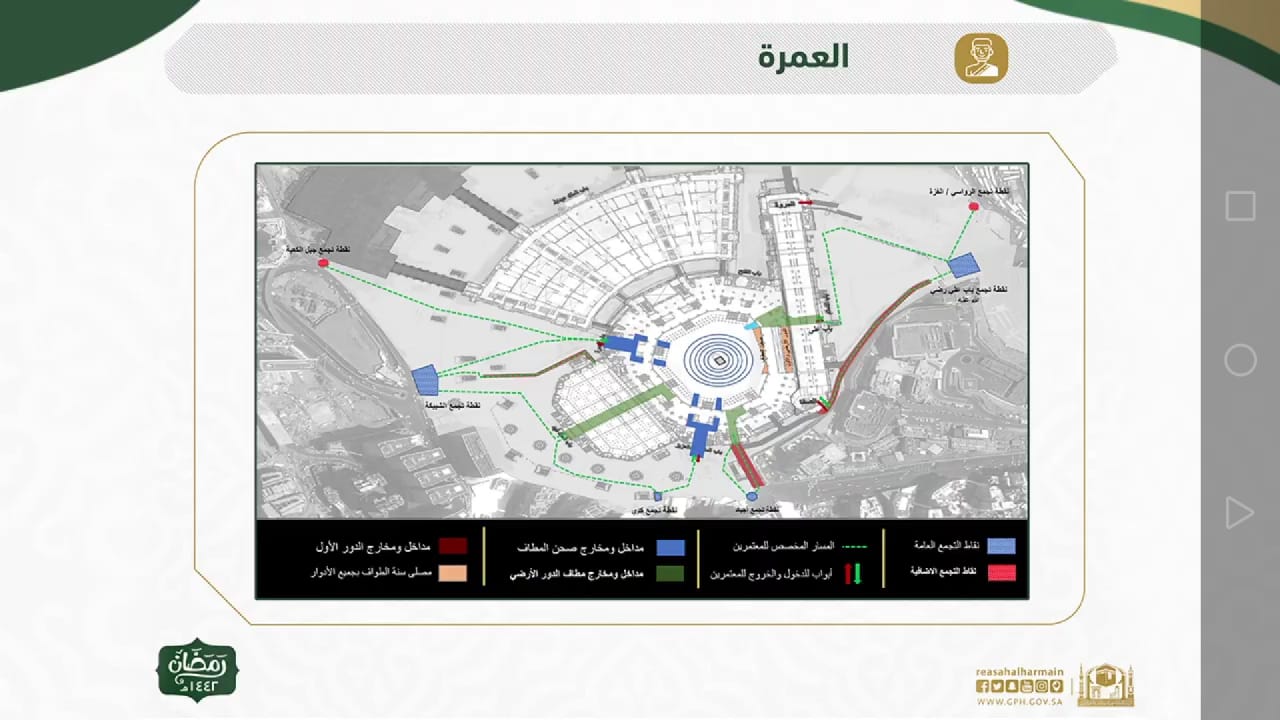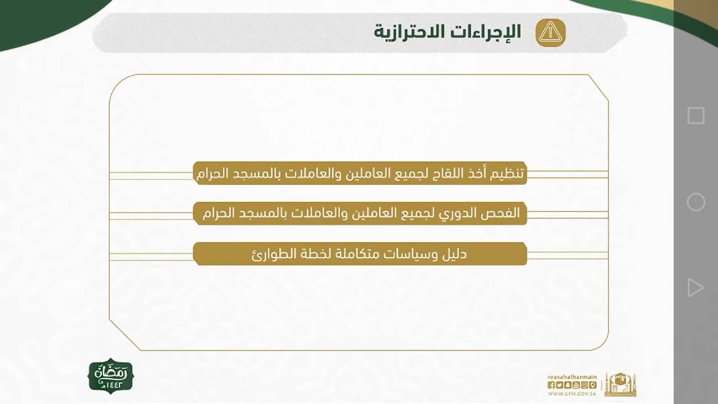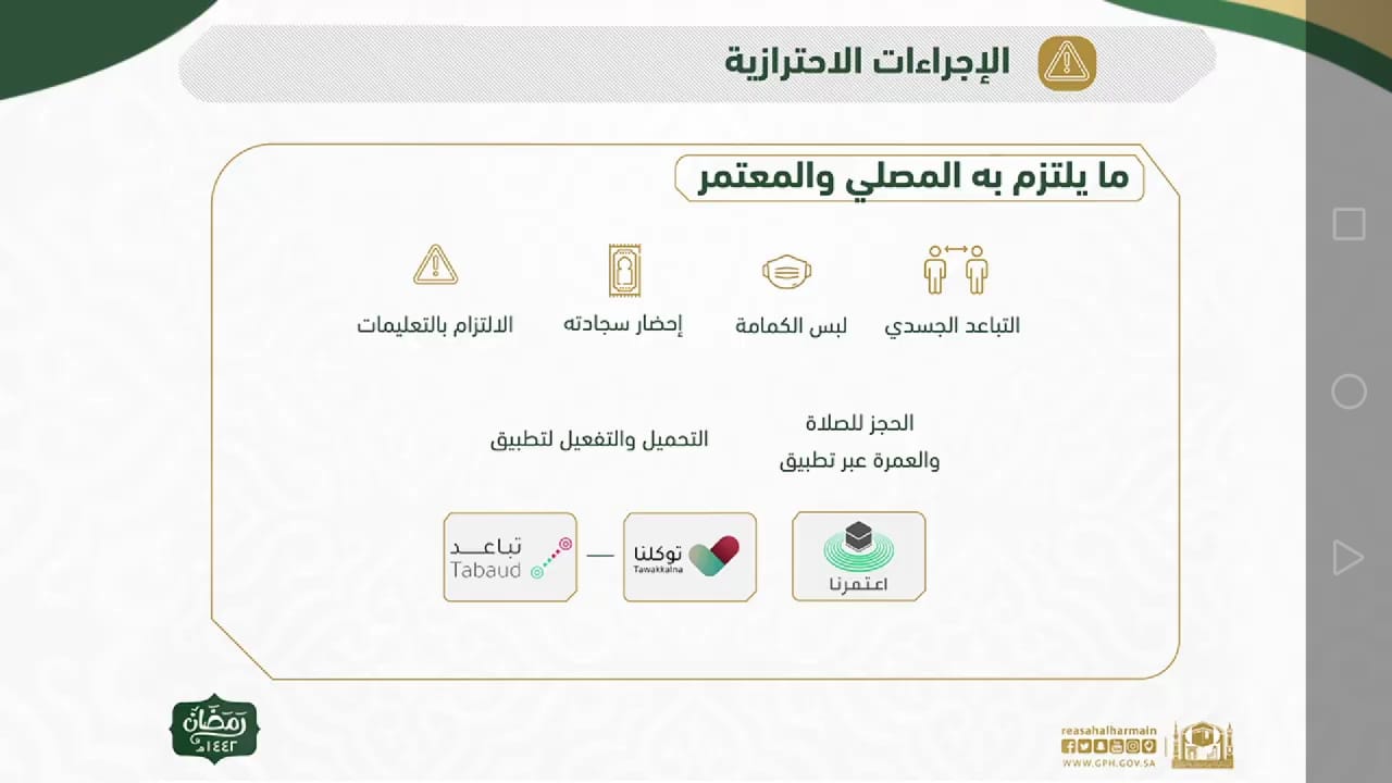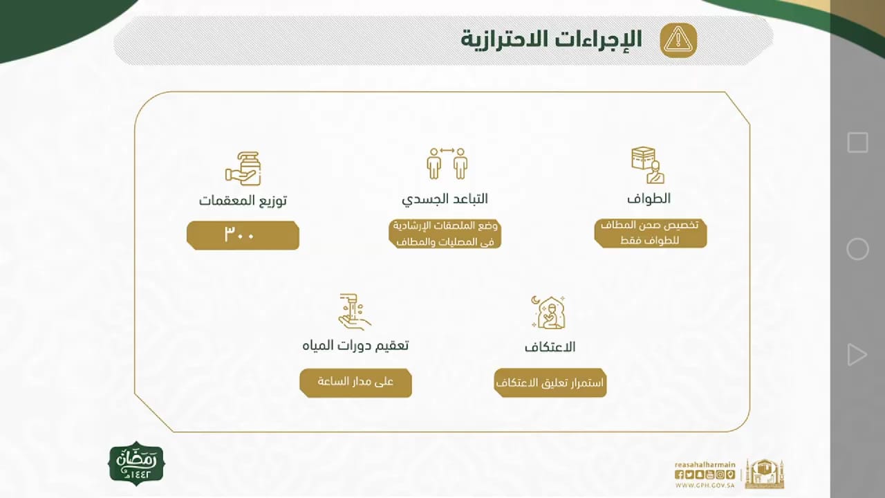 حيث أكد معالي الرئيس العام خلال تدشينه للمحاور، بأن الرئاسة العامة والجهات الأمنية داخل الحرمين الشريفين لن تتهاون في تطبيق الإجراءات الاحترازية، والمحافظة على سلامة زوار وقاصدي الحرمين الشريفين، وسوف يطبق النظام بحزم وقوة فيما يخص الإجراءات الاحترازية واتباع التعليمات الصحية التي أوصت بها الجهات المختصة، للمحافظة على سلامة وصحة ضيوف الرحمن، وأن صحن المطاف سوف يخصص للطواف فقط، وستكون الصلاة خلف المكبرية.