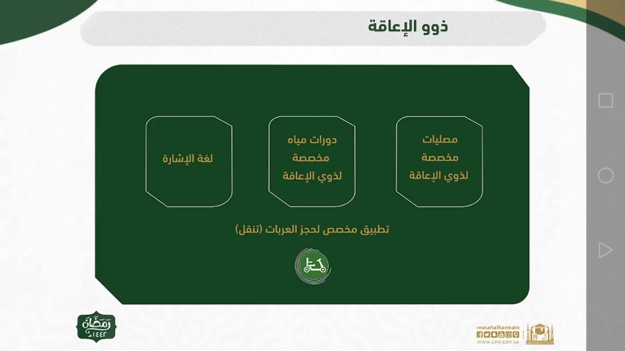 وأكد الشيخ السديس عناية واهتمام الرئاسة العام للأشخاص ذوي الإعاقة وأن الرئاسة خصصت مصليات مهيأة لذوي الإعاقة يتم تطبيق الإجراءات الاحترازية فيها على مدار الساعة، وعدة دورات مياه خاصة لذوي الإعاقة بالساحة الشرفية وأمام جسر أجياد أمام باب الملك فهد، وعدداً من مترجمي لغة الإشارة لخطب الجمعة ولإجابة المستفتين على مدار الساعة، وأطلقت تطبيق (تنقل) الذي يتيح لكبار السن وذوي الإعاقة طلب عربة كهربائية لأداء نسك الطواف والسعي، كما تتيح الرئاسة من خلال مشروع خادم الحرمين الشريفين للترجمة الفورية للخطب بالمسجد الحرام، ويبلغ عدد اللغات المستخدمة في ترجمة الخطب والدروس والمحاضرات إلى عشر لغات، ويقدم المترجمون العاملون في المسجد الحرام خدمة الإرشاد المكاني وترجمة الأسئلة للمفتين بـ (23) لغة، وتسعى الرئاسة من خلال شراكتها وتعاونها مع وزارة الإعلام لإبراز الجهود العظيمة والجليلة التي تقدمها الدولة -رعاها الله- في خدمة المعتمرين والزائرين، كما ستطلق الرئاسة فيلمين وثائقيين وبرنامجا تلفزيونا وبرامج إذاعية وسلسلة من التقارير المرئية على حسابات التواصل الاجتماعي، وأتاحت الرئاسة العديد من التطبيقات الإلكترونية التي تسعى من خلالها لتسهيل تجربة القاصد الكريم، ومن تلك التطبيقات تطبيق (معتمرون) والذي يهدف لمرافقة المعتمر منذ لحظة وصوله إلى المسجد الحرام وإلى لحظة انتهاء مناسكه من خلال عرض المناسك وشرحها وتقديم الإرشادات اللازمة، وتطبيق (تنقل) والذي يهدف لتقديم خدمة الحجز المسبق للعربات الكهربائية لكبار السن وذوي الإعاقة، وكذلك منصة منارة الحرمين والتي تقدم البث المباشر للتلاوات والدروس والخطب من المسجد الحرام بعدة لغات .