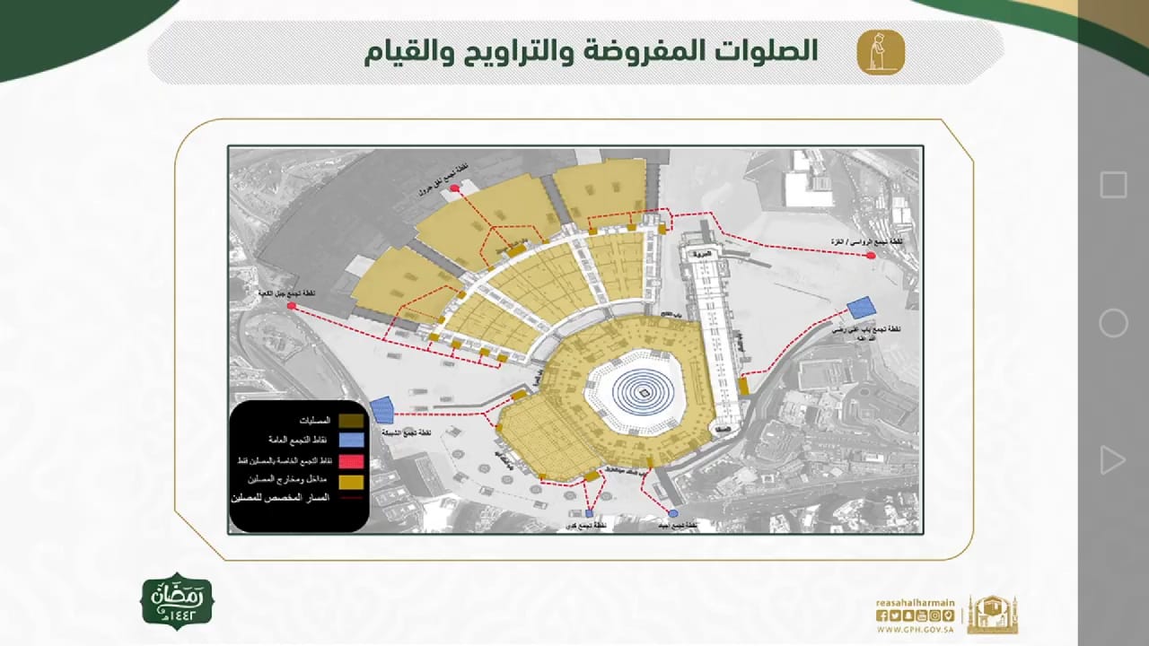 وذكر الشيخ السديس عدة ملامح للخطة من بينها الصلوات المفروضة والتراويح والقيام وصلاة العيد، حيث تهدف الرئاسة إلى تقديم الخدمة إلى المصلين في شهر رمضان بما تفرضه الإجراءات الاحترازية ضد جائحة فايروس كورونا، وسيتم تخصيص مصليات شرفات الدور الأول المطلة على الكعبة المشرفة، والدور الأول من توسعة الملك فهد بالكامل، وسطح وبدروم توسعة الملك فهد، والتوسعة السعودية الثالثة كاملةً بساحاتها الخارجية، والساحة الشرقية بالكامل، وتطبيق الإجراءات الاحترازية في المصليات من خلال وضع الملصقات الإرشادية وتطبيق مسافة التباعد الجسدي، وتعقيم المصليات قبل وبعد كل صلاة، وسيكون دخول المصلين من نقاط تفويج محددة للتأكد والفرز من تصاريحهم، حيث يلزم لدخول المسجد الحرام إصدار تصريح للصلاة من تطبيق اعتمرنا وأيضا إبراز تطبيق توكلنا وتطبيق تباعد .