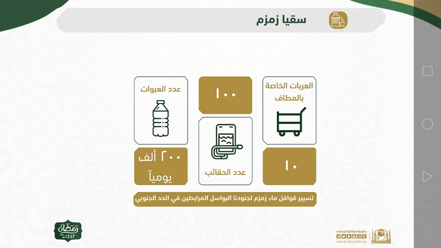 أما ما يخص سقيا زمزم فقال السديس: تهدف الرئاسة لتوزيع مائتي ألف عبوة يومياً، وأن الرئاسة العامة سوف تقوم بتسيير قوافل ماء زمزم لجنودنا البواسل المرابطين بالحدود الجنوبية .