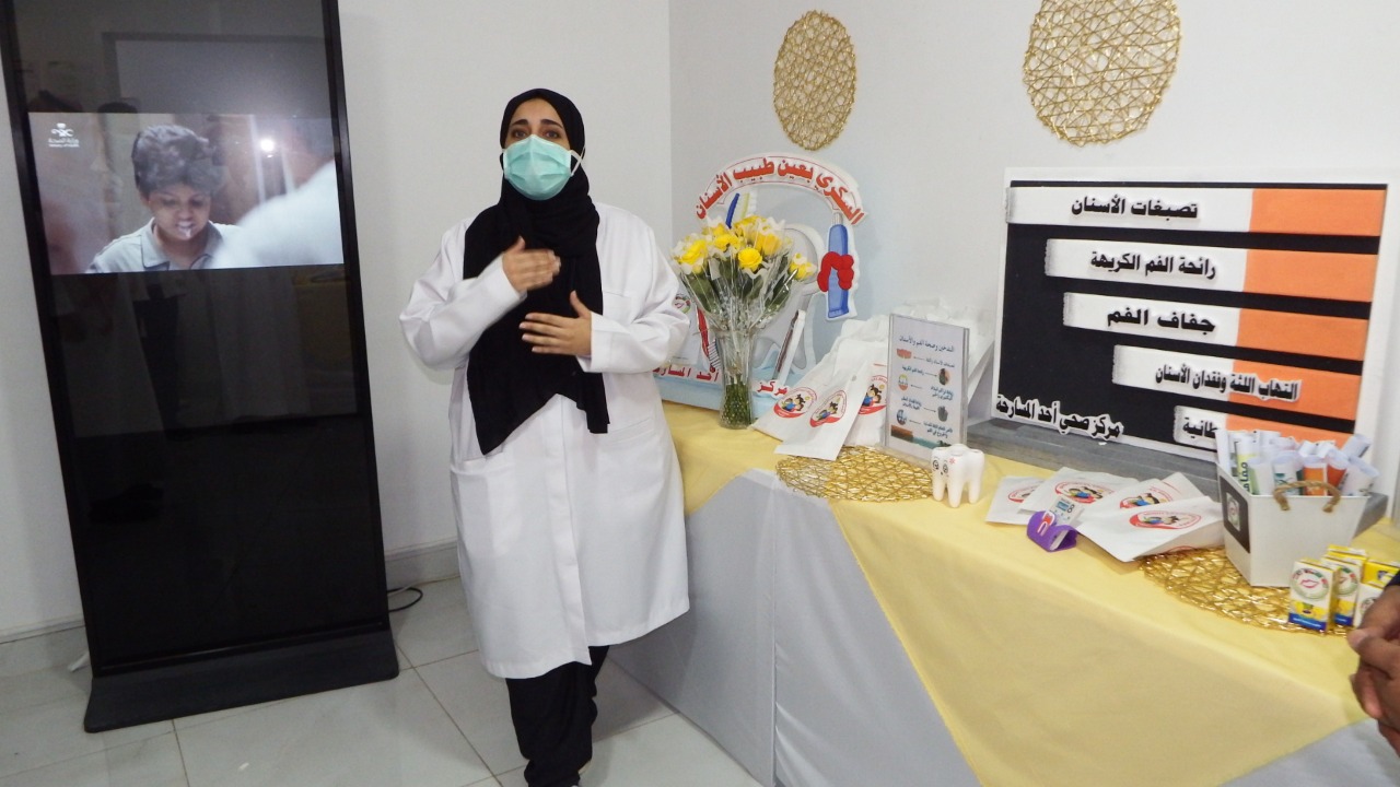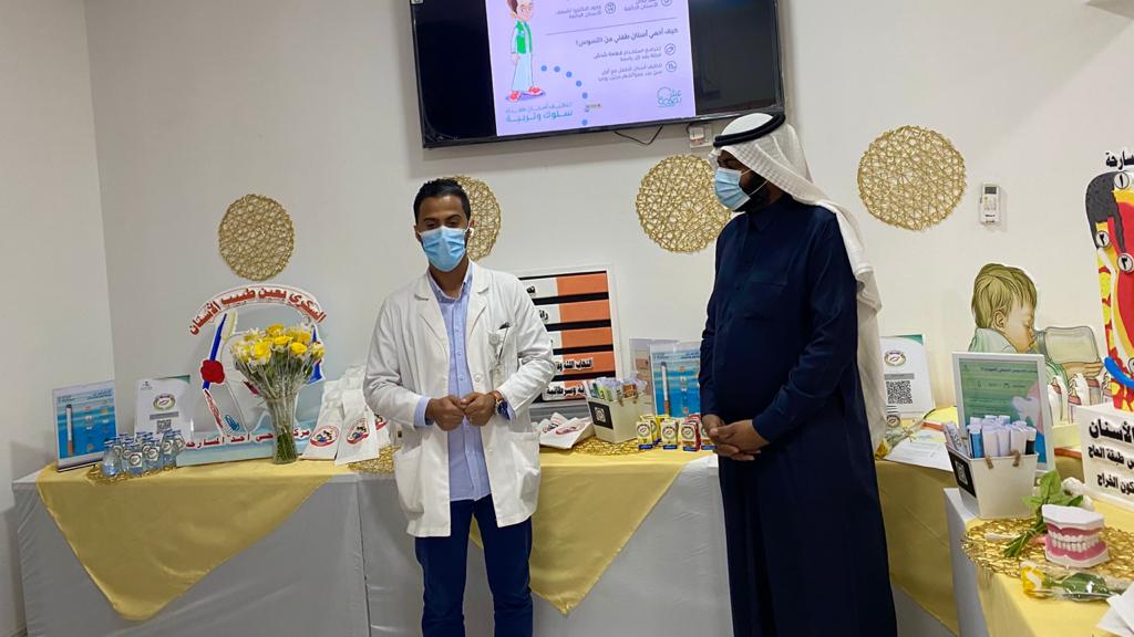 وبعد افتتاح المعرض المصاحب للفعالية تجول الحضور بأقسامه، واستمعوا لشرح طبيبتا الأسنان بالمركز ، عن أهمية المحافظة على صحة الفم والآسنان، وتعزيز العمل الوقائي، والمساعدة في خفض نسب الإصابة بأمراض الفم والأسنان، و تطبيق الاجراءات الوقائية الاكلينيكية على الاسنان بشكل عام، وأهمية الجانب الوقائي والسلوكيات الصحية السليمة التي تساعد على الوقاية من الأمراض.