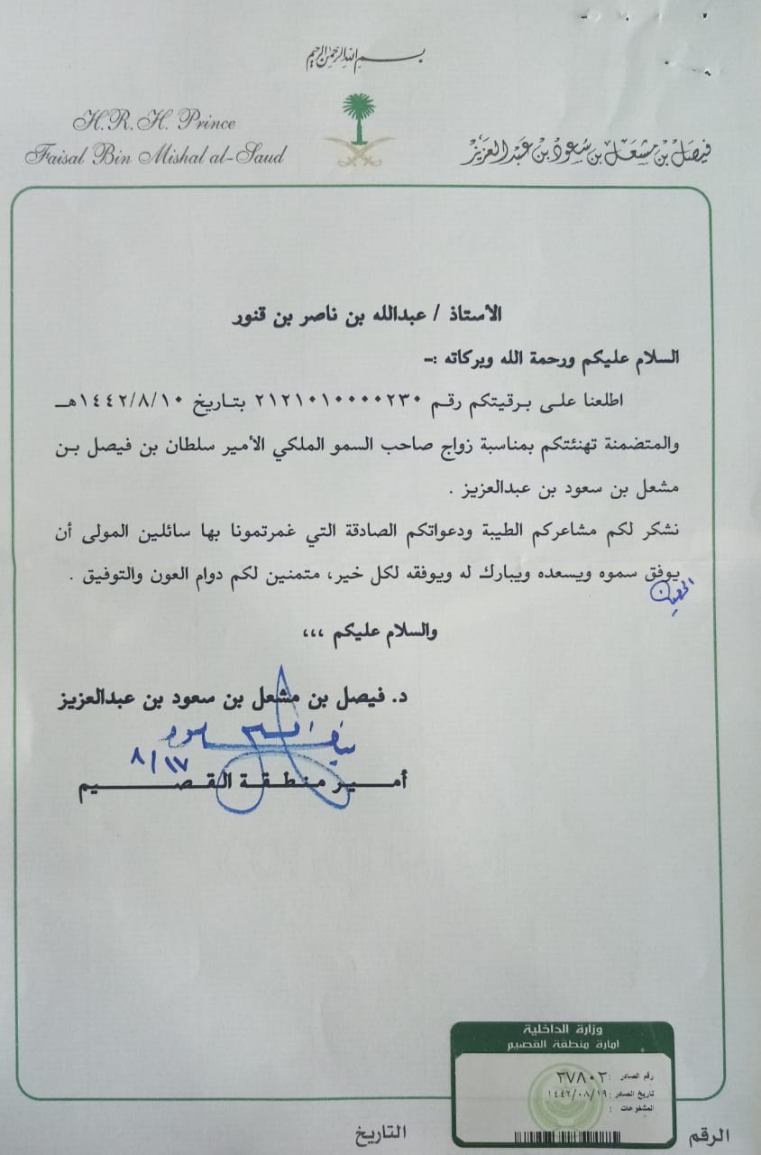 وقال سمو الأمير فيصل بن مشعل بن سعود في رسالته الكريمة : “السلام عليكم ورحمة الله وبركاته .. اطلعنا على برقيتكم التي وصلتنا يوم ١٠ / ٨ / ١٤٤٢ هـ والمتضمنة تهنئتكم بمناسبة زواج صاحب السمو الملكي الأمير سلطان بن فيصل بن مشعل بن سعود بن عبدالعزيز.