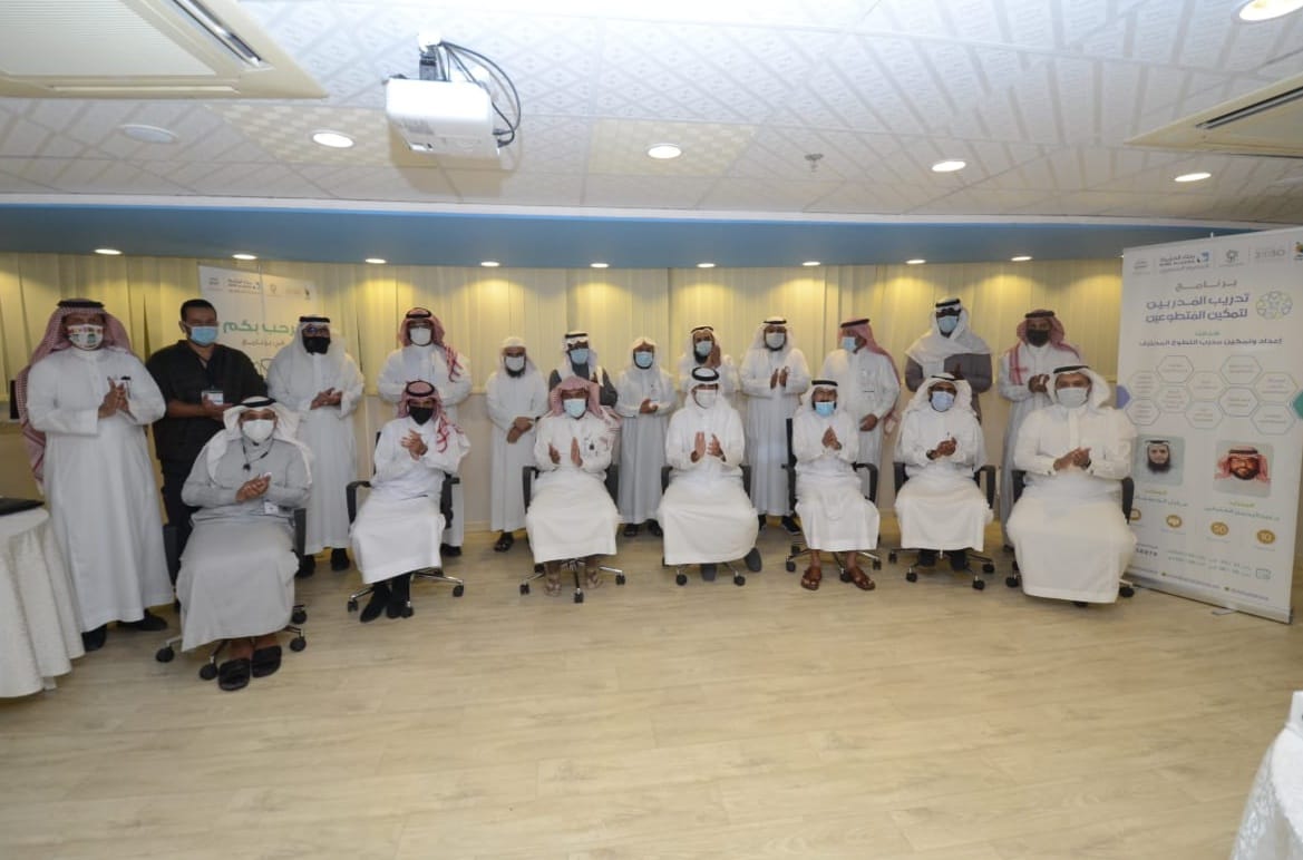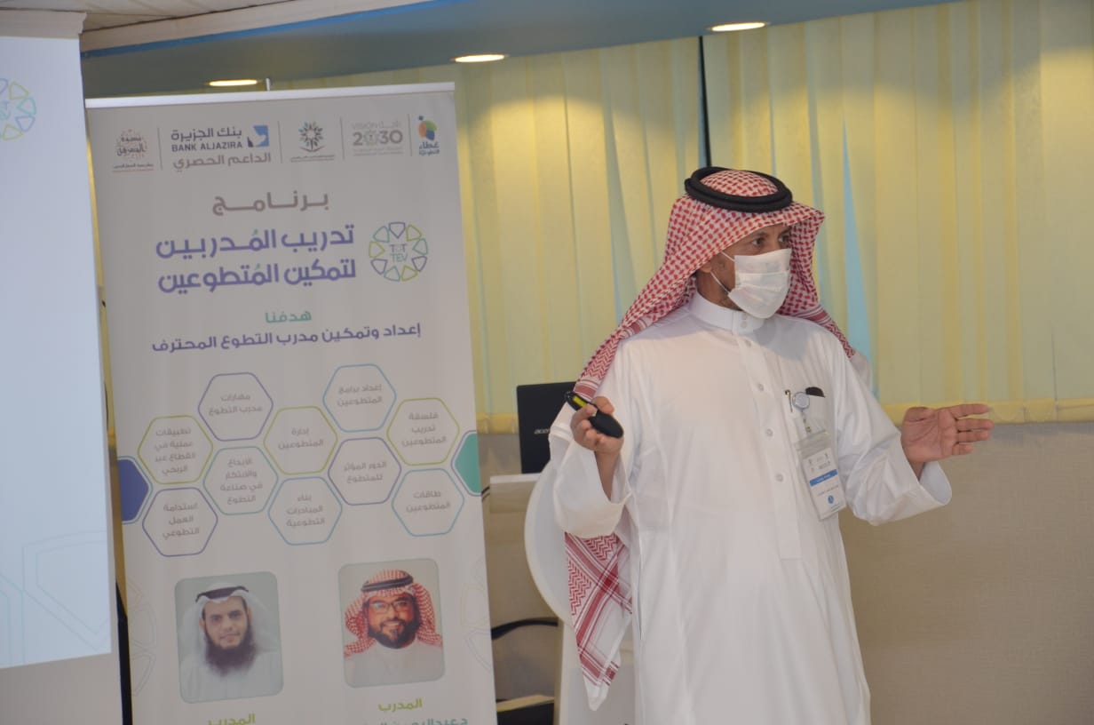 ويهدف البرنامج إلى إعداد وتمكين مدرب التطوع المحترف المعتمد, مساهمة منها لتحقيق رؤية المملكة 2030 للوصول إلى مليون متطوع، حيث شارك حضوريا وفق الاجراءات الاحترازية (٢٠) متدربًا من نخبة وقادة العمل التطوعي, و (٢٥) متدربة الكترونياً عن بعد من قياديات العمل التطوعي.