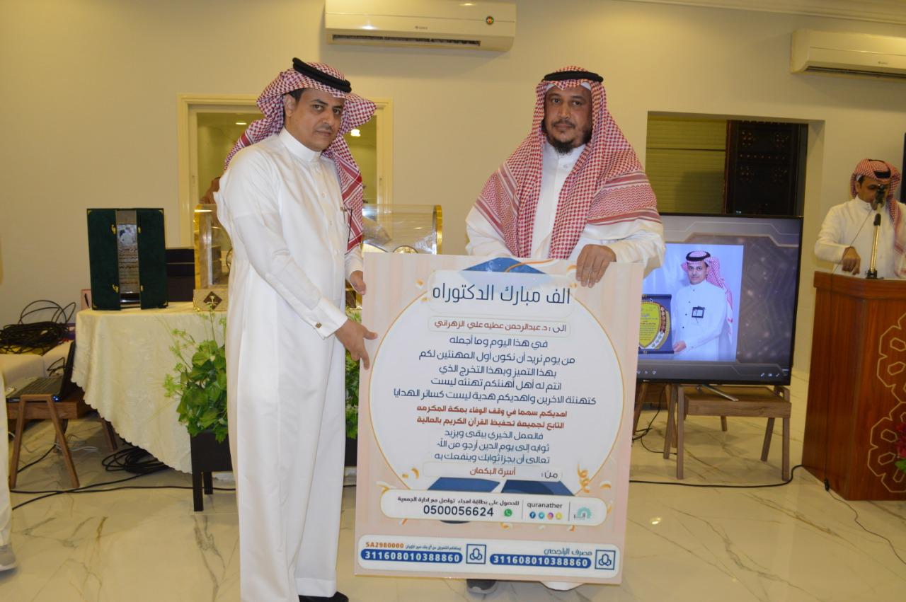 احتفلت أسرة البكمان بالمنطقة الشرقية ومنطقة الباحة بإبنها الدكتور/ عبدالرحمن بن عطيه الزهراني وذلك بمناسبة حصوله على درجة الدكتوراة في النحو والصرف وفقه اللغة بتقدير ممتاز مع مرتبة الشرف من كلية اللغة العربية بجامعة الإمام محمد بن سعود الإسلامية بالرياض نظير رسالته ( نتائج التحصيل في شرح التسهيل ) وبدأ الحفل بآيات من الذكر الحكيم ثم كلمة الأسرة ألقاها نيابة عنهم الاستاذ/ عبدالله بن عطيه الزهراني ومن ثم عرض مرئي لسيرة المحتفى به ، كما شارك الأحبة من خارج المنطقة عبر برنامج الزووم للتعبير عن فرحتهم وفخرهم بهذا الإنجاز وكان للشعر حضور بقصيدة مهداه من الشاعر الاستاذ / علي الزهراني للدكتور المحتفى به ، وتوالت القصائد والكلمات من الحضور ، وقدمت أسرة البكمان الهدايا للمحتفى به ولوالديه وصاحبها لفتة رائعة بإهداه وقف خيري ، وقدم الدكتور شكره وامتنانه للجميع على هذه اللفته الغير مستغربة ، ليختتم الحفل بتناول طعام العشاء .
