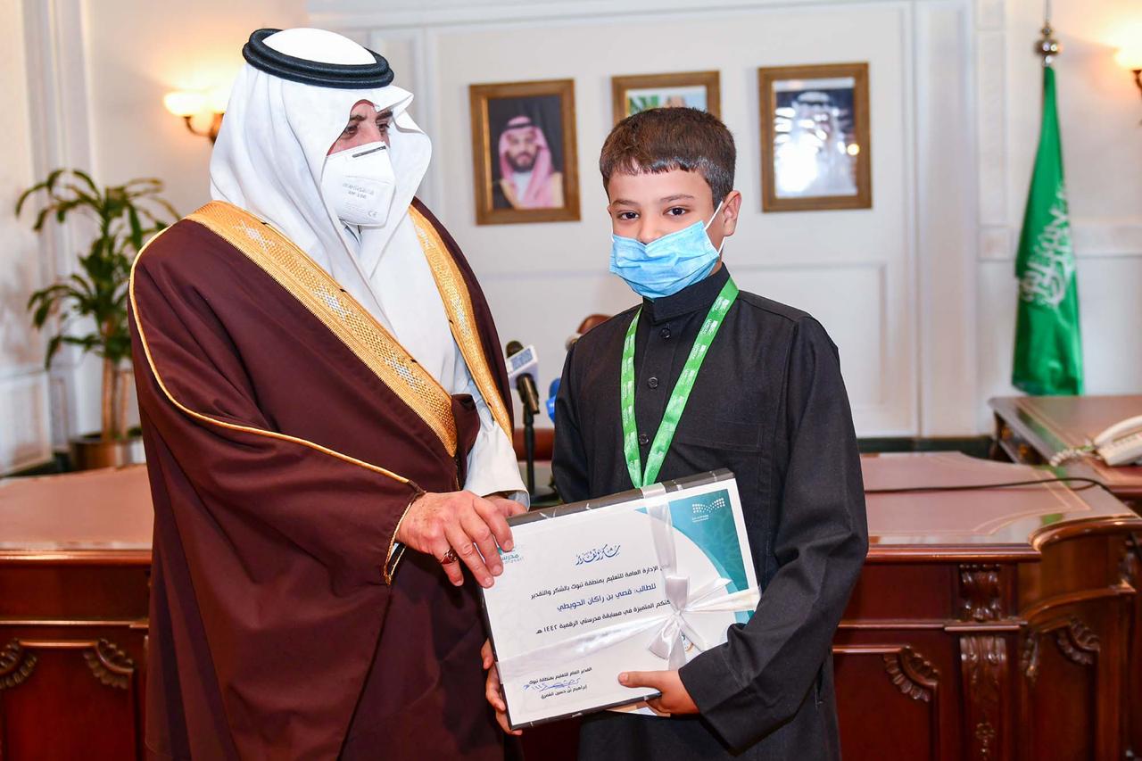 وكان الحفل المعد بهذه المناسبة بُدئ بكلمة ألقاها المدير العام للتعليم بالمنطقة إبراهيم بن حسين العُمري , أشار فيها إلى أن وزارة التعليم تعاملت مع متطلبات العمل عن بُعد من البداية بكل اقتدار , وكانت منصة مدرستي الخيار الأمثل وصولاً بها إلى مسابقة ” مدرستي الرقمية ” والتي شهدت تنافس إيجابي بين مناطق ومحافظات المملكة, مضيفاً أن المسابقة شاركت فيها مدارس ومكاتب وأقسام إدارة التعليم بالمنطقة, حيث بلغ عدد المشاركين أكثر من 71 ألف مشارك ومشاركة منهم 5724 من أولياء الأمور, معرباً في ختام حديثة عن شكره لسمو أمير المنطقة على دعمه واهتمامه بالمسابقة ولرعايته حفل تكريم الفائزين والفائزات.