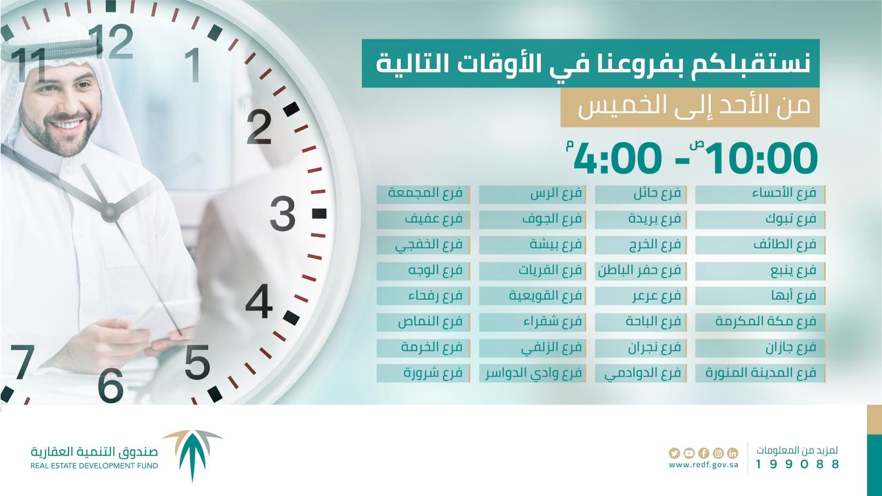 أعلن صندوق التنمية العقارية عن أوقات عمل الفروع في كافة مناطق المملكة ومركز الاتصال الموحد(199088) خلال شهر رمضان المبارك. وأوضح المتحدث الرسمي للصندوق حمود العصيمي، أن جميع الفروع بمناطق المملكة تعمل من الساعة العاشرة صباحاً وحتى الرابعة مساءً، بينما فرع الرياض وجدة والدمام تعمل من الساعة 10 صباحاً وحتى الخامسة مساءً، مشيراً إلى أن فرع مدينة الرياض والدمام وجدة تعمل خلال أيام الجمعة والسبت من الساعة الواحدة مساءً وحتى الرابعة مساءً.
