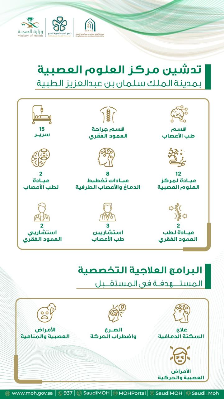 ويضم المركز عدة مراكز للعلوم العصبية: منها قسم جراحة المخ والأعصاب، وقسم طب الأعصاب للأطفال، إضافة إلى قسم الفسيولوجيا العصبية، حيث بدأت المرحلة الأولى بافتتاح قسم طب الأعصاب وقسم جراحة العمود الفقري.
