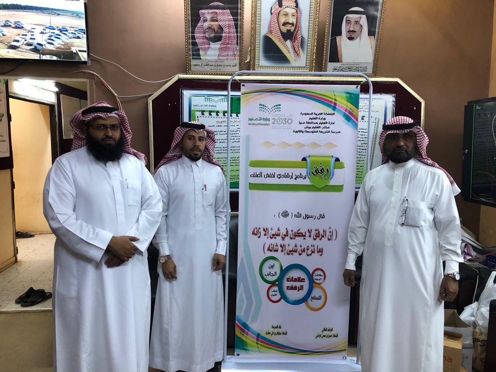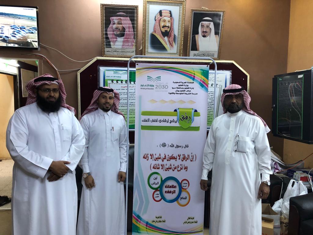 تعد ظاهره العنف مشكلة في المجتمعات فبدأ الاهتمام العالمي بظاهرة العنف نتيجة لتطوير الوعي النفسي والاجتماعي لدى المجتمعات وضرورة لتوفير المناخ المناسب لنمو الإنسان نموا سليما وجسديا واجتماعيا ومن هذا المنطلق أعدت متوسطة وثانوية الشريعة برنامج رفق تحت إشراف المرشدالطلابي الاستاذ /حسن عارضي وبقيادة قائد المدرسة /سليمان مطاري حيث نفذت خطة لبرنامج رفق احتوى ورشة عمل وحوار مع الطلاب وإذاعة صباحية عن أهمية الرفق في الإسلام وذلك بإشراف رائد النشاط الأستاذ / أحمد فقيه كما قام وكيل المدرسة الاستاذ / عطية البناء بتعريف الطلاب حول البرنامج حيث شكر قائد المدرسة جميع من قام على هذا البرنامج .
