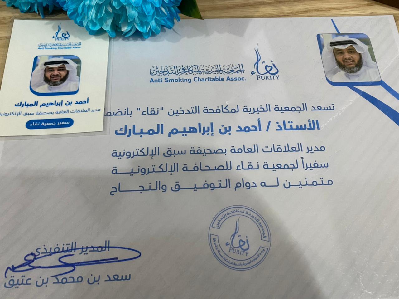 الزميل “المبارك” سفيراً لـ”نقاء” لمكافحة التدخين https://www.alshaamal.com/?p=148888 تم النشر في: 22 أبريل، 2021 8:19 م 360220 صحيفة الشمال الإلكترونية aan-morshd منحت الجمعية الخيرية لمكافحة التدخين “نقاء”، الزميل أحمد بن إبراهيم المبارك مدير العلاقات العامة بالزميلة صحيفة “سبق” وسام سفير الجمعية للصحافة الإلكترونية؛ نظير تعاونه وما يقدمه من خدمات في سبيل تحقيق أهداف الجمعية ودعم برامجها.