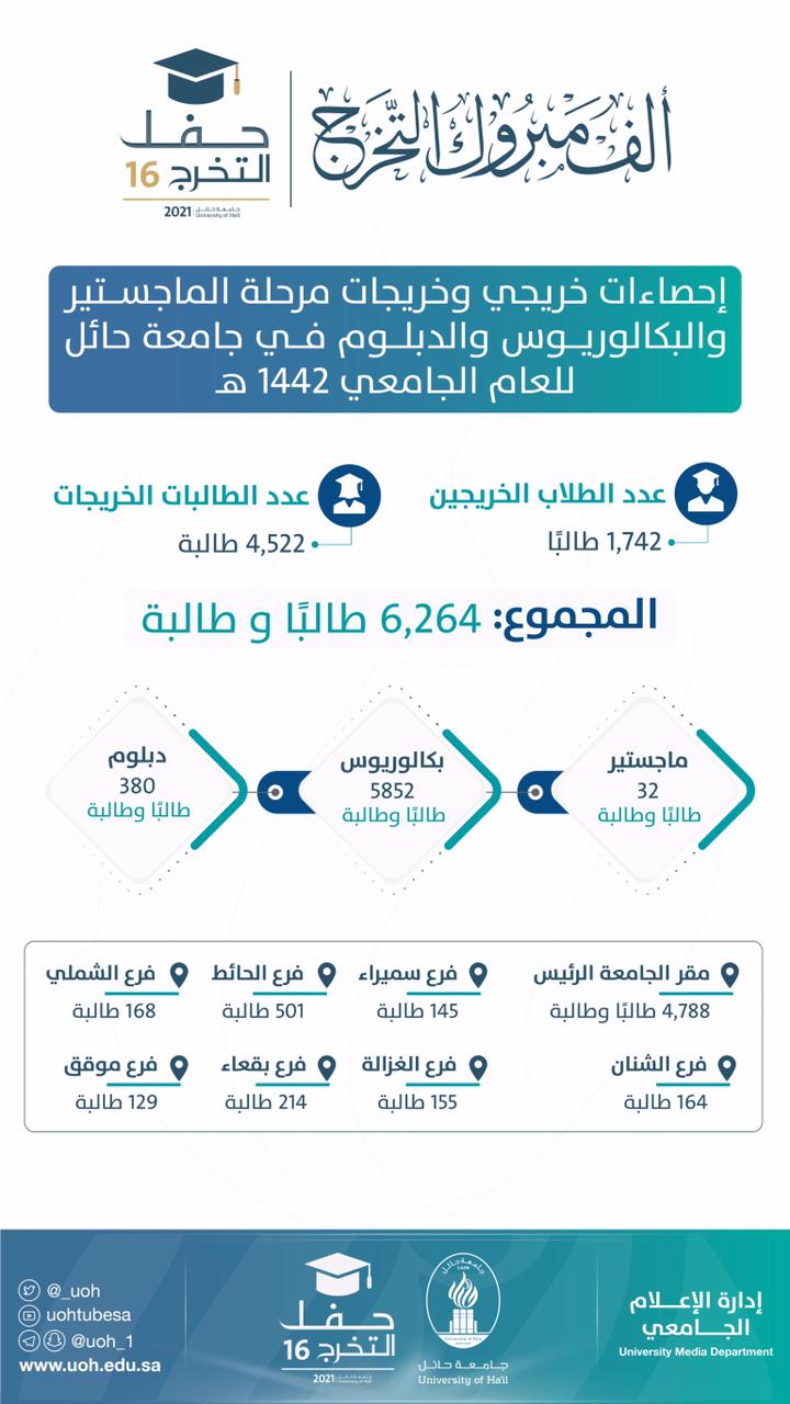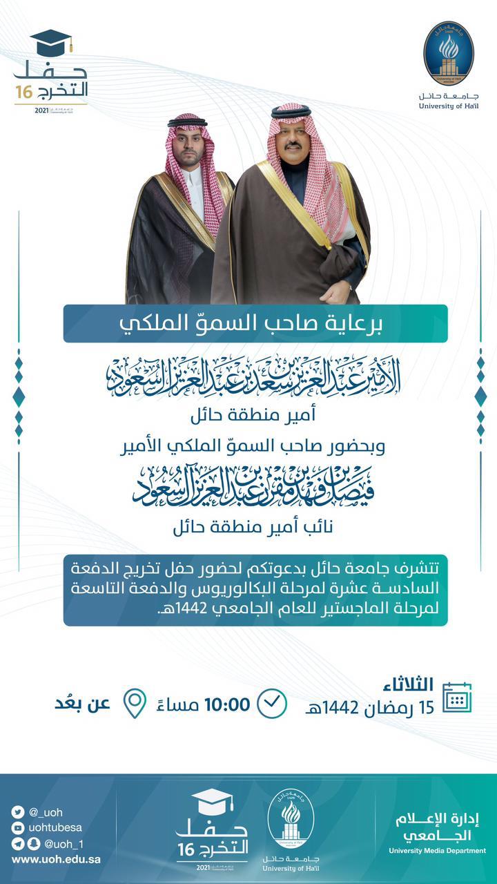 يرعى صاحب السموّ الملكي الأمير عبدالعزيز بن سعد بن عبدالعزيز آل سعود، أمير منطقة حائل، وبحضور صاحب السموّ الملكي الأمير فيصل بن فهد بن مقرن، نائب أمير المنطقة، حفل تخرج الدفعة السادسة عشرة لمرحلة البكالوريوس، والدفعة التاسعة لمرحلة الماجستير، عن بُعد، اليوم الثلاثاء 15رمضان الساعة 10مساءً.