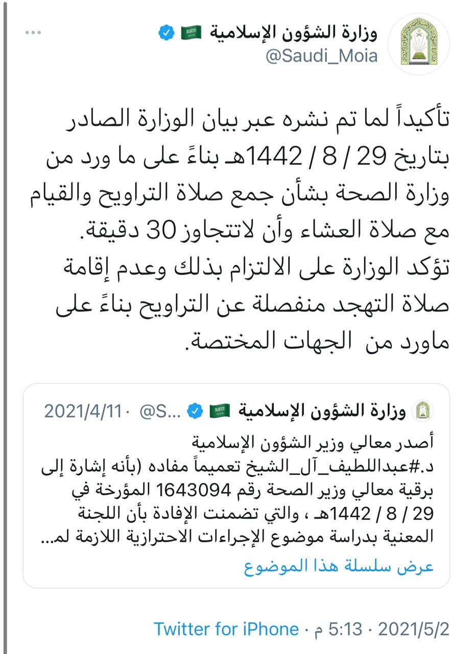 أوضحت وزارة الشؤون الإسلامية والدعوة والإرشاد بأنه تأكيداً لما تم نشره عبر بيان الوزارة الصادر بتاريخ 29 / 8 / 1442هـ بناءً على ما ورد من وزارة الصحة بشأن جمع صلاة التراويح والقيام مع صلاة العشاء وأن لاتتجاوز 30 دقيقة, فقد أكدت فيه على الالتزام بذلك وعدم إقامة صلاة التهجد منفصلة عن التراويح بناءً على ماورد من الجهات المختصة.