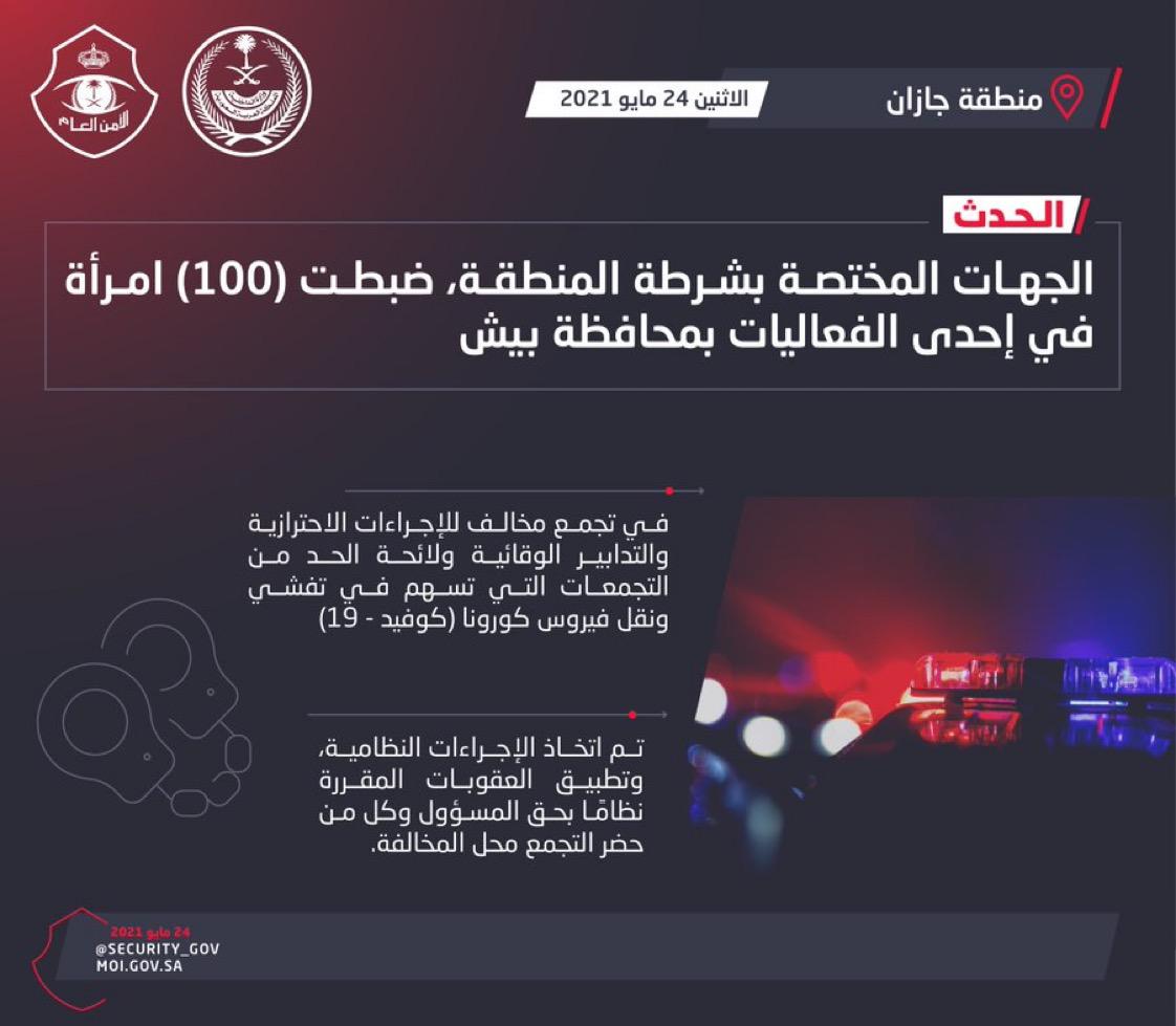 صَرّح المتحدث الإعلامي لشرطة منطقة جازان الرائد نايف حكمي، بأن الجهات المختصة بشرطة المنطقة ضبطت (100) امرأة في إحدى الفعاليات بمحافظة بيش، في تجمع مخالف للإجراءات الاحترازية، والتدابير الوقائية ولائحة الحد من التجمعات التي تسهم في تفشي ونقل فيروس كورونا (كوفيد – 19)، وجرى اتخاذ الإجراءات النظامية، وتطبيق العقوبات المقررة نظامًا بحق المسؤول وكل من حضر التجمع.