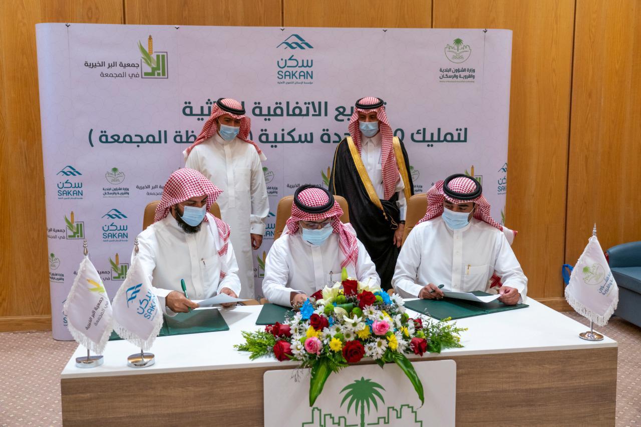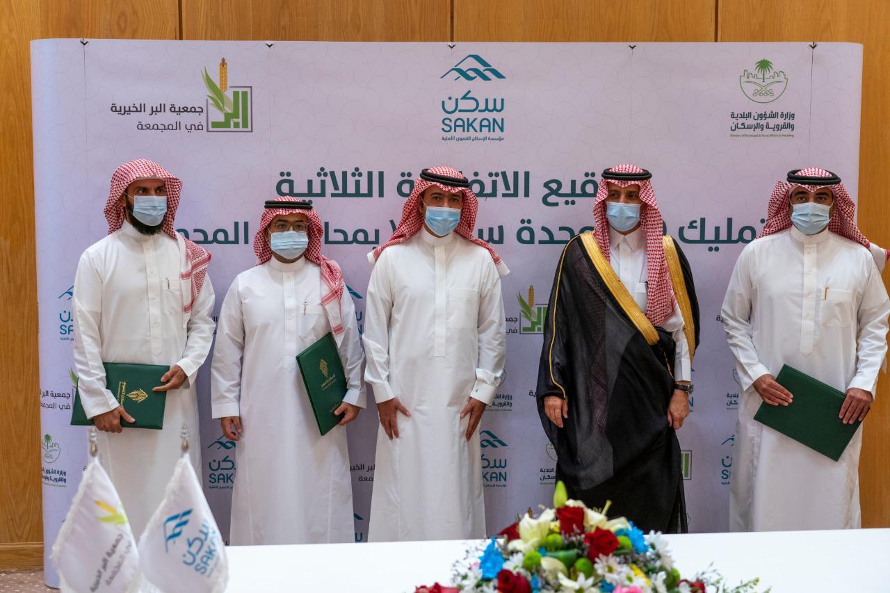 ووقع الاتفاقية وكيل وزارة الشؤون البلدية والقروية والإسكان للإسكان التنموي المهندس أحمد بن علي القرعاوي، ورئيس مجلس إدارة جمعية البر بالمجمعة توفيق محمد العسكر، وعضو مجلس الأمناء لمؤسسة الإسكان التنموي الأهلية يزيد إبراهيم النفيسة.