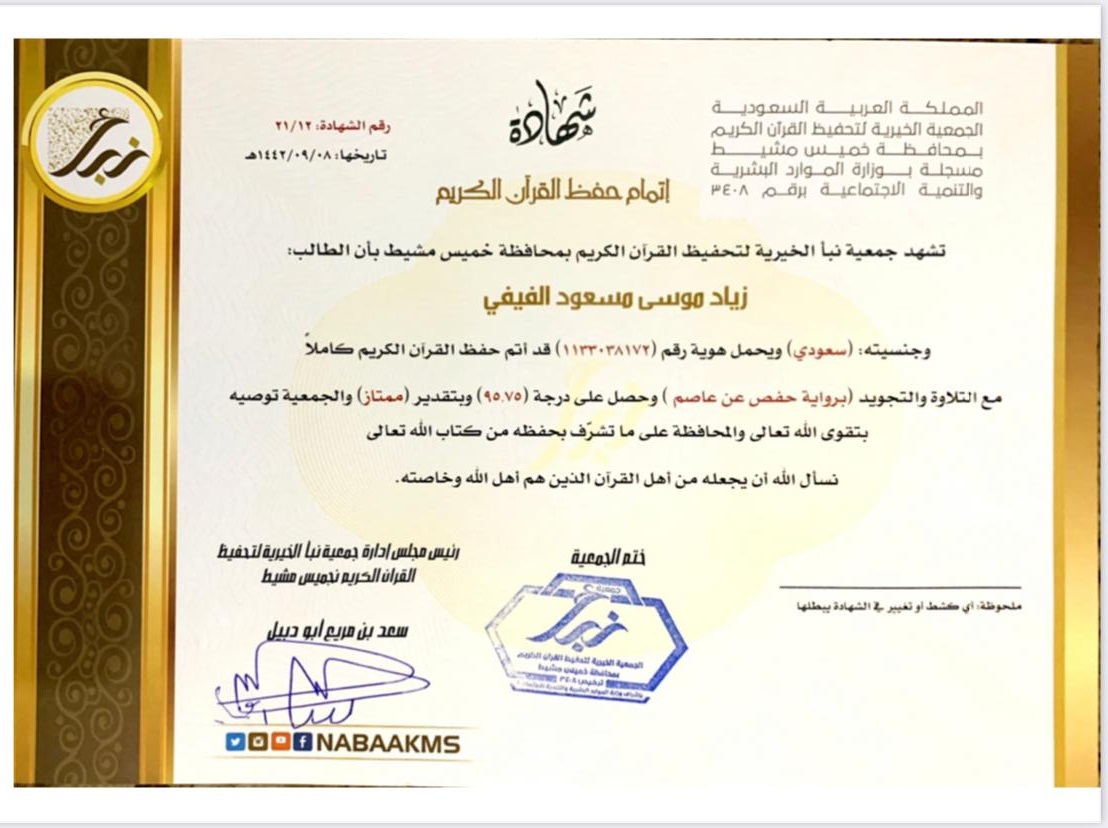 اجتاز الشاب : زياد بن موسى بن مسعود الفيفي 15″ عاما اختبار جمعية نبأ الخيرية لتحفيظ القرآن الكريم بمحافظ خميس مشيط لحفظ كتاب الله كاملا.