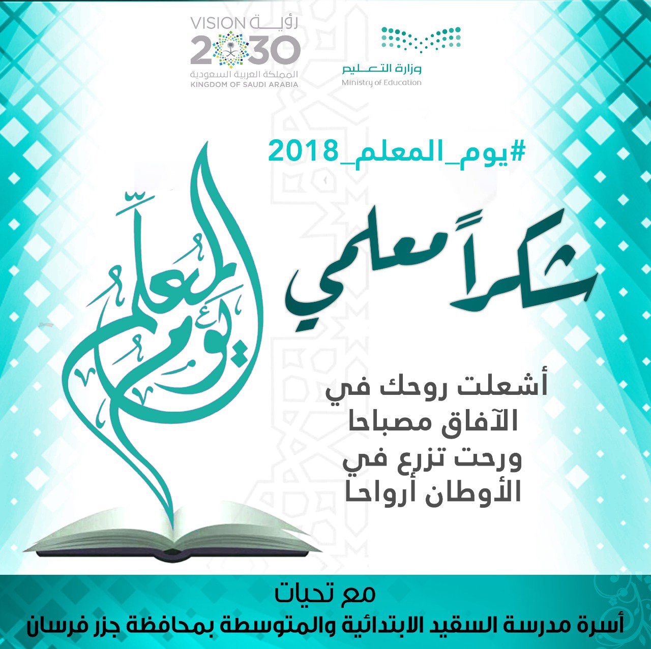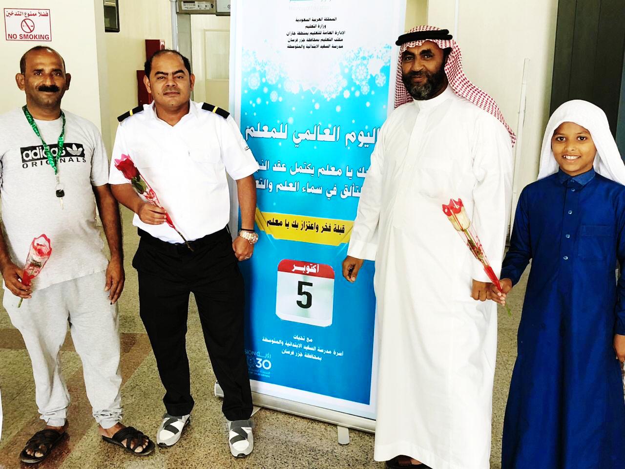 نفذت مدرسة السقيد الابتدائية والمتوسطة برنامج الاحتفاء بـ«اليوم العالمي للمعلم» والذي يصادف الخامس من تشرين الأول (أكتوبر) من كل عام، حيث وزعت المدرسة وورد على المعلمين و المواطنين والمقيمين احتفاء بهذه المناسبة الغالية علينا، واحتفاءً بما يقدمونه المعلمون و المعلمات في نفوس الطلاب والطالبات، وتقديراً للجهود المبذولة من المعلمين والمعلمات للارتقاء بمستوى التعليم. حيث قدم رائد النشاط محمد علي خميسي بالتعاون مع المعلمين فيلما وثائقيا عن المعلم دوره الأساسي في إعداد الطالب