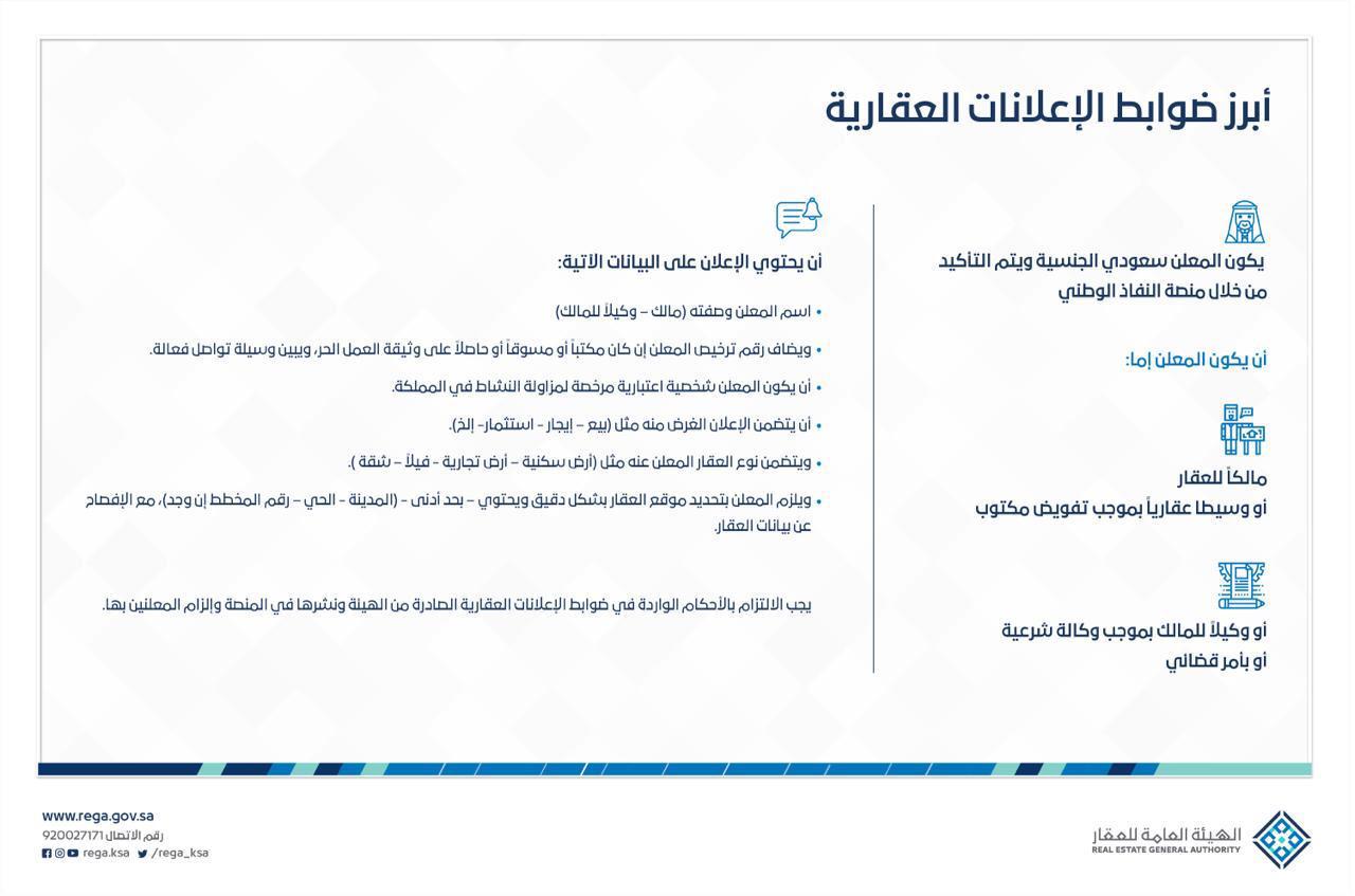 وتشمل الضوابط التي تم إصدارها اليوم، أن يكون المعلن سعودي الجنسية، وأن يتم تسجيل المعلنين عن طريق منصة النفاذ الوطني، أو أن يكون المعلن مالكًا للعقار، أو وكيلاً للمالك بموجب وكالة شرعية، أو وسيطاً عقارياً بموجب تفويض مكتوب أو بأمر قضائي، إضافة إلى ضرورة أن يتضمّن الإعلان على اسم المعلن وصفته أو شخصية اعتبارية مرخصة لمزاولة النشاط في المملكة.