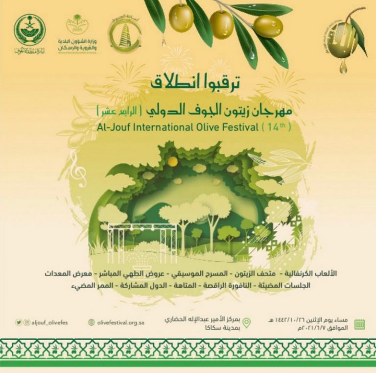 يُطلق أمير منطقة الجوف فيصل بن نواف بن عبدالعزيز مهرجان زيتون الجوف الدولي الرابع عشر، مساء يوم الاثنين المقبل، بمركز الأمير عبدالإله الحضاري بمدينة سكاكا.
