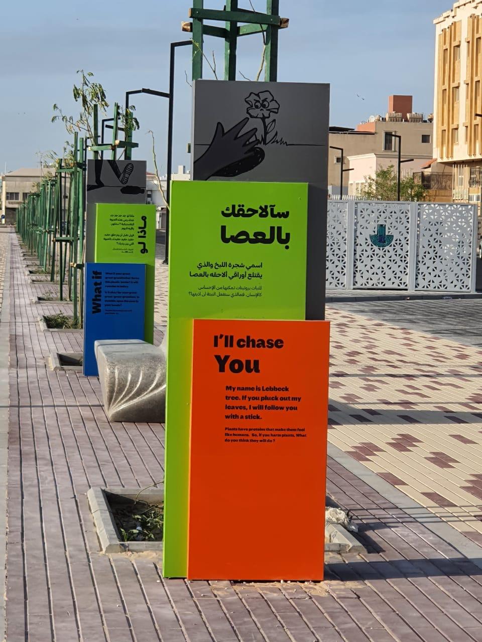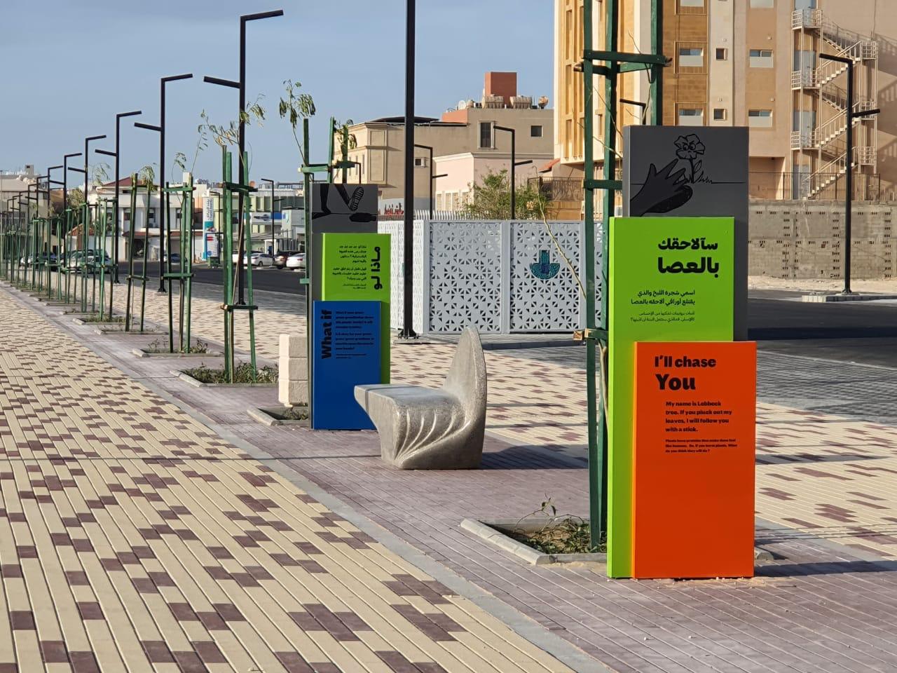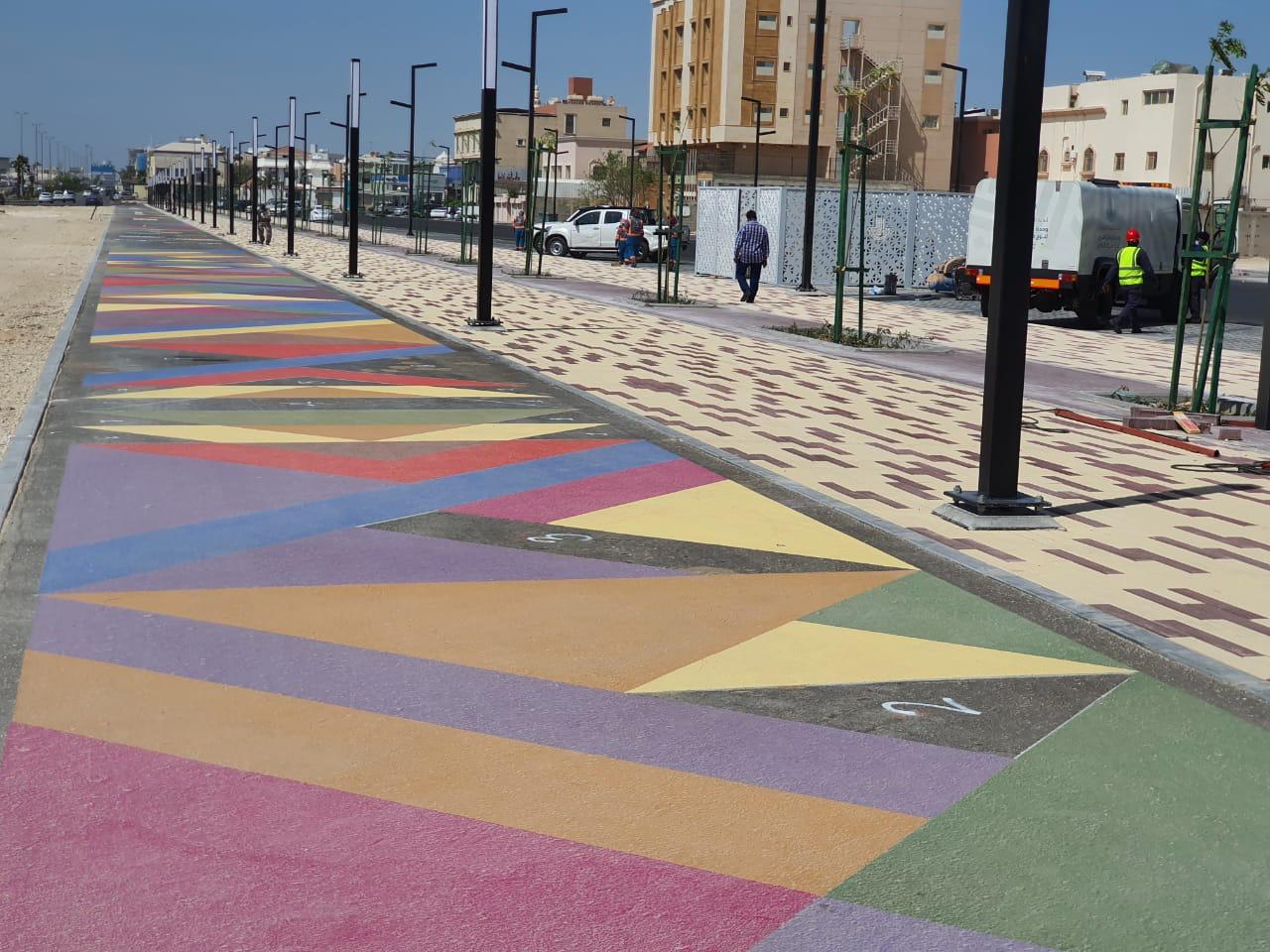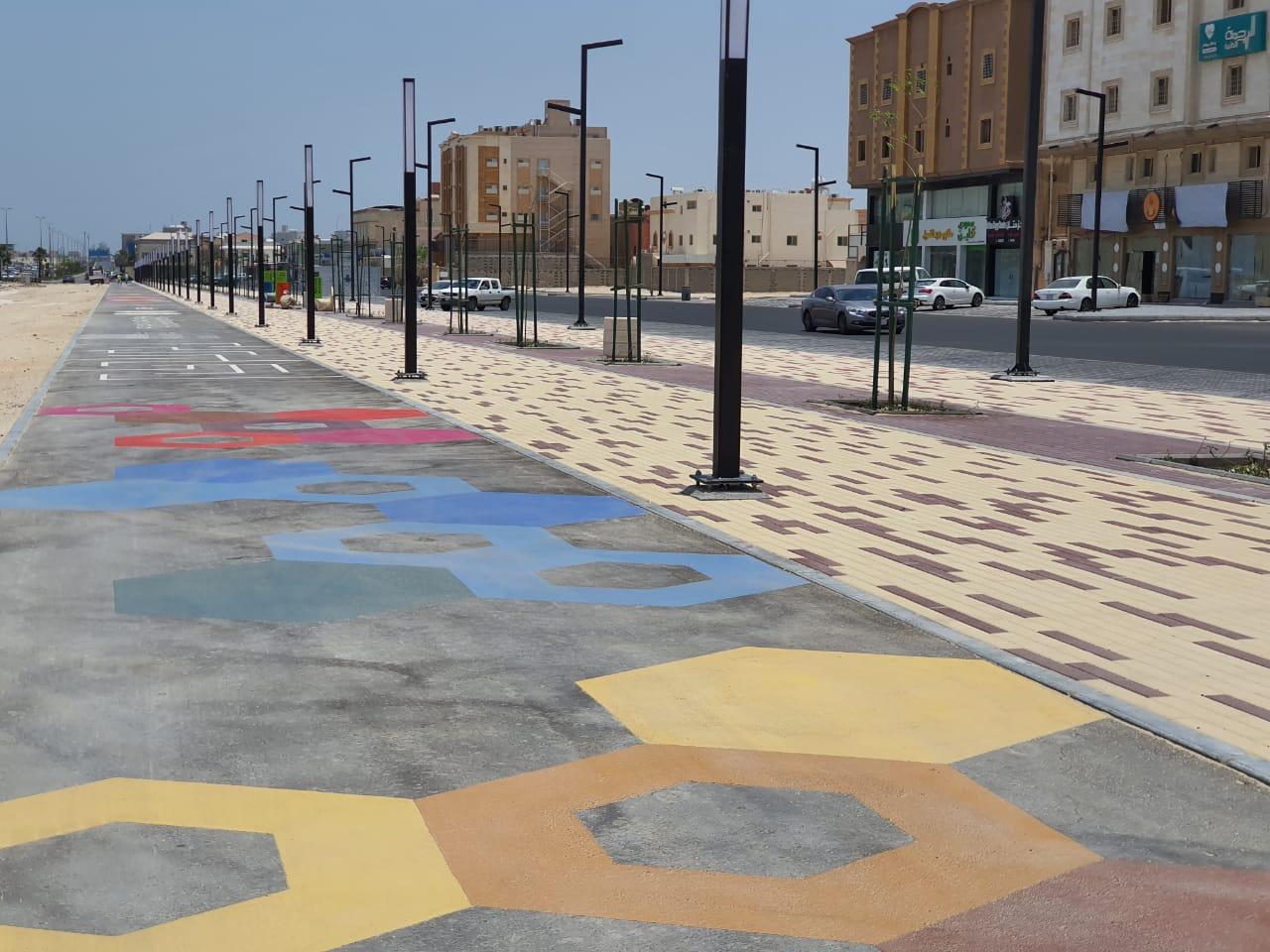 وأضاف المتحدث الرسمي بأن الممشى يتضمن مساراً تفاعلياً للأطفال، بمسارين من الانترلوك بعرض ٤ متر لكل مسار وبطول ٥٠٠ متر بتصميم عصري يتوسطهم منطقة بعرض ٢ متر بها أحواض زراعة لأشجار الظل والشجيرات المزهرة وكراسي للجلوس بتصميم وتصنيع عصري وأعمدة إنارة ديكورية بارتفاع ٥ متر لإضاءة الممشى، كما يحتوي على مسار تفاعلي على طريقة (Tactical Urbanism) بالأسفلت الملون برسومات وألعاب تعليمية وتفاعلية للأطفال بطريقة عصرية وجذابة، بالإضافة إلى لوحات توعويه إرشاديه للزوار،