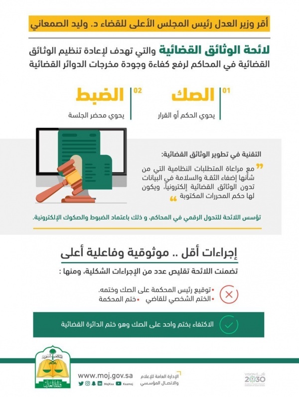 أعلنت وزارة العدل، أنه بدءًا من غد الأحد الموافق 27 محرم 1440هـ، سيبدأ العمل بلائحة الوثائق القضائية، بهدف تقليص الإجراءات مع موثوقية أعلى. وكان وزير العدل الدكتور وليد الصمعاني، أقر في أبريل الماضي، لائحة الوثائق القضائية، التي تهدف لإعادة تنظيم الوثائق القضائية في المحاكم لرفع كفاءة وجودة مخرجات الدوائر القضائية وتؤسس اللائحة وفقًا لإنفوجرافيك نشرته الوزارة عبر حسابها الرسمي بموقع التواصل تويتر، للتحول الرقمي في المحاكم وذلك باعتماد الضبوط والصكوك الإلكترونية، مع مراعاة المتطلبات النظامية التي من شأنها إضفاء الثقة والسلامة في البيانات؛ حيث تدون الوثائق القضائية إلكترونيًا ويكون لها حكم المحررات المكتوبة. وتهدف اللائحة إلى تنفيذ إجراءات أقل مع موثوقية وفاعلية أعلى؛ حيث تضمنت تقليص عدد من الإجراءات الشكلية ومنها: توقيع رئيس المحكمة على الصك وختمه، والختم الشخصي للقاضي، وختم المحكمة، والاكتفاء بختم واحد على الصك وهو ختم الدائرة القضائية.