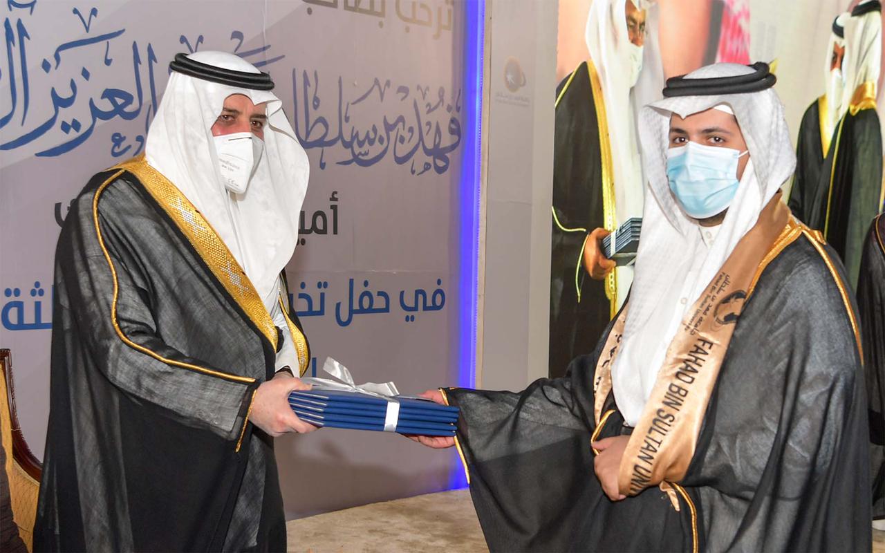 رعى أمير منطقة تبوك رئيس مجلس أمناء جامعة فهد بن سلطان الأمير فهد بن سلطان بن عبدالعزيز مساء أمس ، حفل تخريج الدفعة الـ 13 من طلاب وطالبات الجامعة من حملة درجة البكالوريوس ، والدفعة الثامنة من حملة الماجستير للعام الجامعي 1441 /1442هـ ، والبالغ عددهم 465 طالب وطالبة , حيث كان في استقبال سموه لدى وصوله لمقر الجامعة رئيس الجامعة الدكتور محمد بن عبدالله اللحيدان.