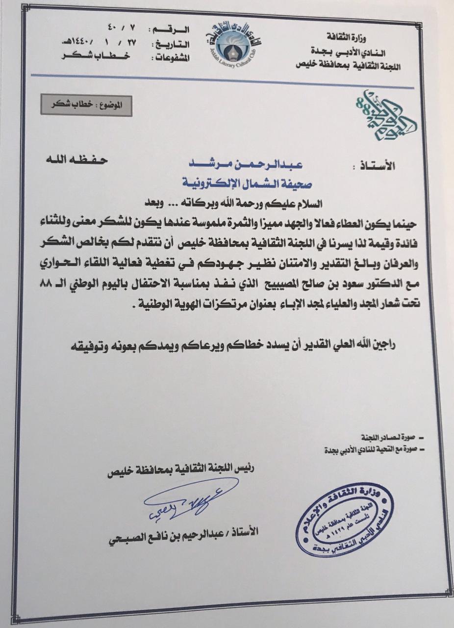 وبهذه المناسبة يتقدم مجلس إدارة صحيفة ” الشمال ” الالكترونية ونيابة عن جميع أعضاء الصحيفة بخالص الشكر والتقدير لرئيس اللجنة الثقافية بمحافظة خليص الاستاذ عبدالرحيم بن نافع الصبحي على هذا التكريم مؤكدين أن هذا الخطاب مصدر فخر واعتزاز لجميع منسوبي الصحيفة راجين المولى عزوجل دوام التوفيق والسداد لجميع لمنسوبي اللجنة الثقافية بمحافظة خليص.