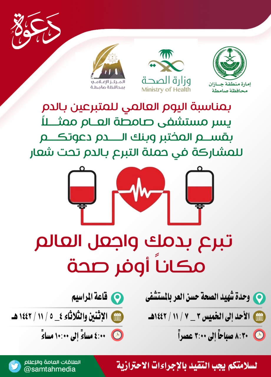 ينظم مستشفى صامطة العام- ممثلاً بقسم المختبر وبنك الدم- حملة للتبرع بالدم تحت شعار” تبرع بدمك واجعل العالم مكاناً أوفر صحة” بالمحافظة. ويأتي تنفيذ هذه الحملة تزامناً مع اليوم العالمي للمتبرعين بالدم والذي يصادف 14 من يونيو من كل عام.