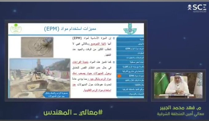 وتضمنت المحاضرة التي القاها معالي الأمين عرض تجربة الأمانة في تطوير واستخدام خلطة الشرقية لردم الحفريات (EPM)، لأعمال البنية التحتية وتمديد خدمات المرافق العامة”.